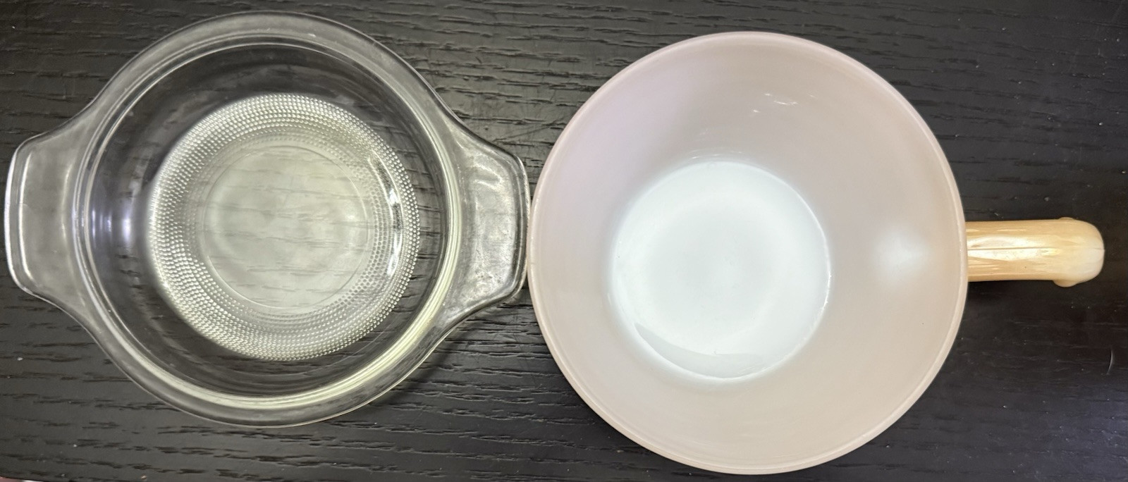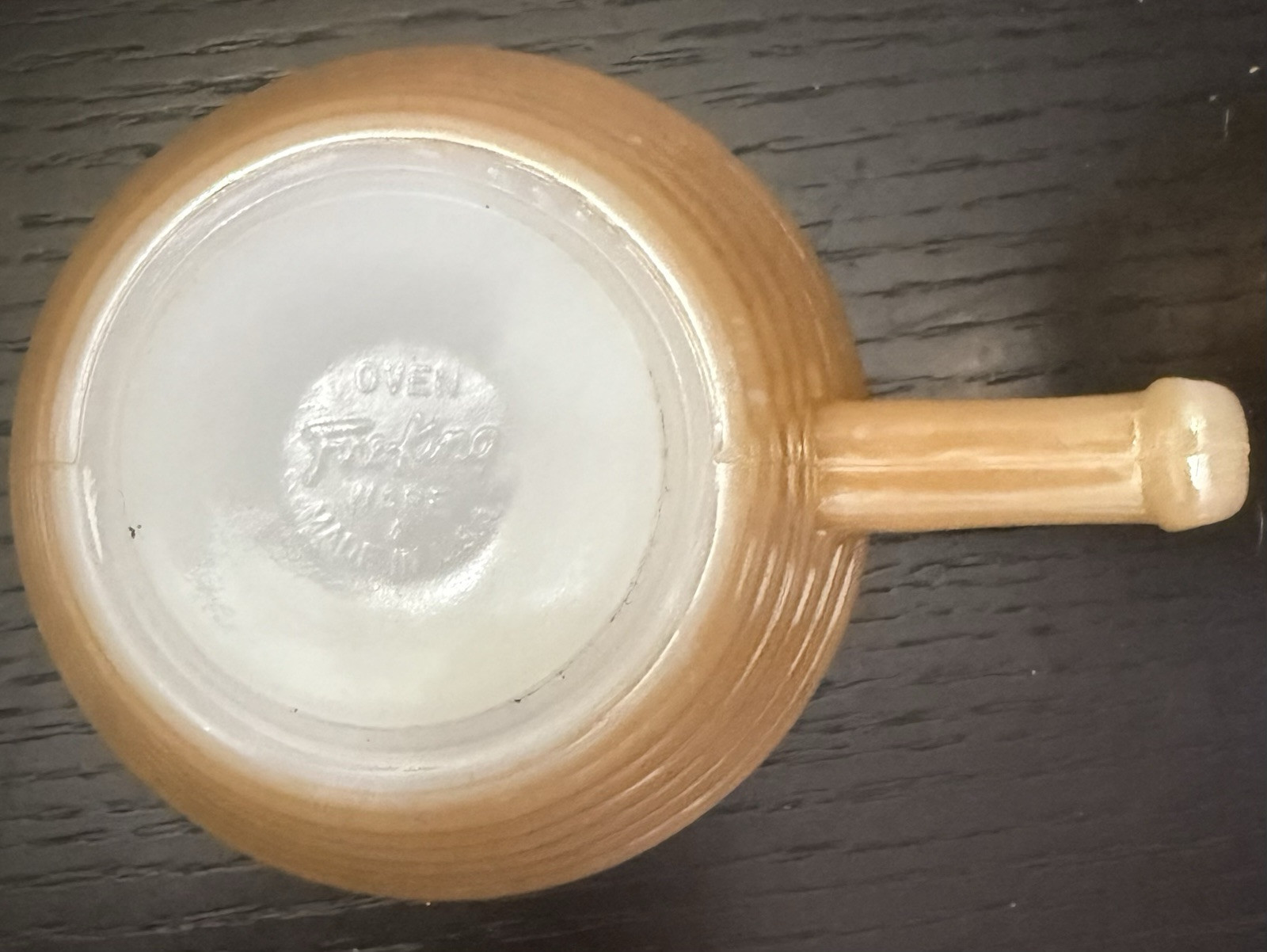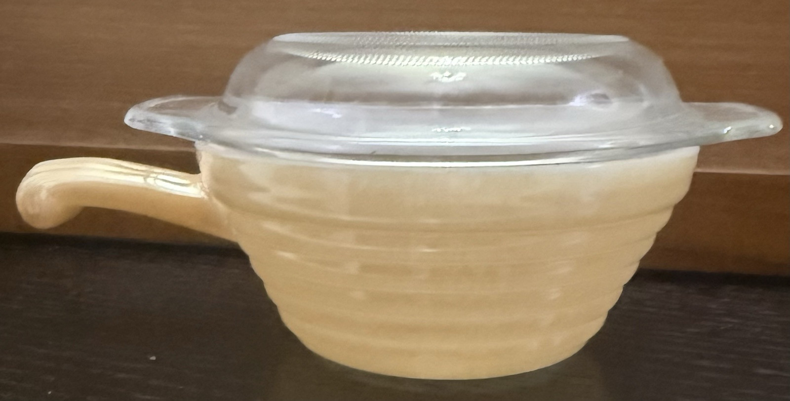 This vintage Fire-King peach luster beehive soup bowl is a must-have for any collector or lover of milk glass. The bowl has a diameter of 5 inches and stands at 2 1/8 inches tall, with a lid included. The beehive shape and vintage pattern make it a unique and charming piece for any occasion. It is in excellent condition and is perfect for display or use. Don't miss out on adding this vintage item to your collection!