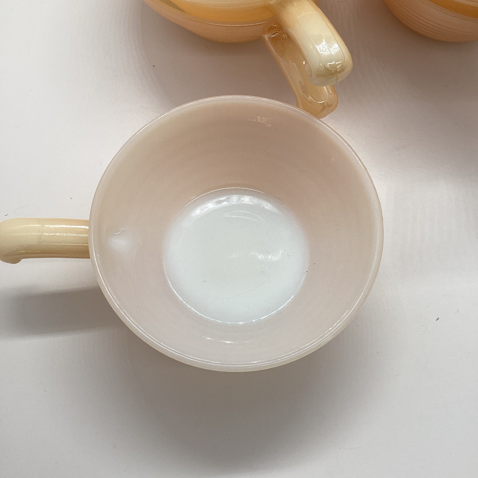 Elevate your kitchen decor with this charming set of 4 Fire-King Peach Luster Beehive Bowls, a genuine nod to mid-century modern design. Each bowl boasts a glossy finish and the classic retro aesthetic that's been cherished for generations. Made in the USA during the 1960s, these bowls are a testament to the craftsmanship of that era, featuring the distinctive beehive shape that's both unique and timeless. Ideal for all occasions, these bowls are not only practical but also collectible, impressing with their originality and quality. They're a perfect addition for those who appreciate vintage glassware or anyone looking to infuse a touch of nostalgia into their home. Whether used for serving or display, these Fire-King bowls are a delightful piece of Americana that resonates with the spirit of the past.