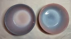 The product is a set of 2 vintage Fire King Pink/Black Ombré bowl stackable cereal bowls from Anchor Hocking. Made of glass with a glossy finish, these round bowls feature a multicolor ombré pattern and measure 2 inches in depth and 4.5 inches in diameter. Manufactured in the United States during the 1960s, these collectible bowls are a unique addition to any kitchen or dining space, embodying a retro design with a fire-themed aesthetic.