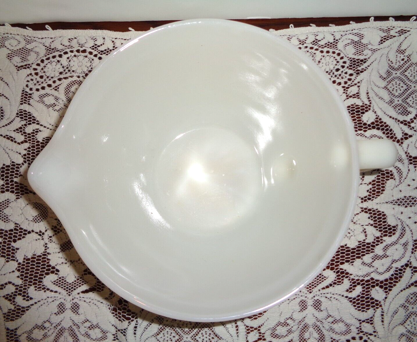 AWESOME VINTAGE FIRE KING OVEN WARE GLASS BATTER BOWL-WHITE This listing is for an awesome piece of Fire King oven ware. It is a white glass handled batter bowl. It measures 4” tall and 8” long not counting the handle. It is in excellent condition, but there is a scratch on the bottom that could have been done during production. If you have any questions, please email me. If you purchase more items from my store, I’ll combine shipping if I can. Thank you for visiting my listing.