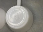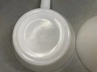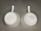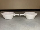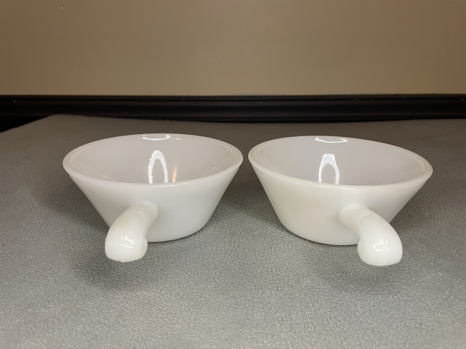 This vintage Fire King White Milk Glass Chili Soup Lug Handle Bowls Set of 2 is a classic piece of American-made dinnerware from the mid-century modern era. Made of glossy white milk glass with a round shape and a unique lug handle design, these soup bowls are perfect for all occasions and can be enjoyed by teens, adults, and even unisex kids. The set includes two original Fire King bowls with an impressed backstamp, showcasing the brand's quality craftsmanship and timeless style. Ideal for collectors or those looking to add a touch of retro charm to their kitchen table. Please inspect photos carefully