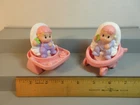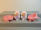 Vintage Fisher Price Little People Play House replacement Pink Baby Highchair (or Walker) and Stroller + two identical baby figures / twins. The highchair/ walker / activity table and strollers are both vintage; the babies are newer style; all in excellent condition. Lot of 4 pcs.