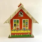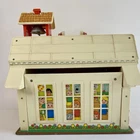 Fisher Price Play Family School partial set, vintage from the early 1970s, containing: School house Little People figures: a blonde teacher and 4 kids; 2 are original from the set (Black boy and redhead girl) and 2 came from other sets (white boys with baseball caps); 1 baseball cap boy is all plastic, and the others have wood bodies with plastic heads 1 green teacher chair and 4 yellow student desks Merry-go-round and swing set Craft table (not part of original set) The entire set is in good to very good used condition, having been played with by a few generations over the past 50 years; see photos for current condition. It's clean and sturdy and ready to be played with by the next few generations!