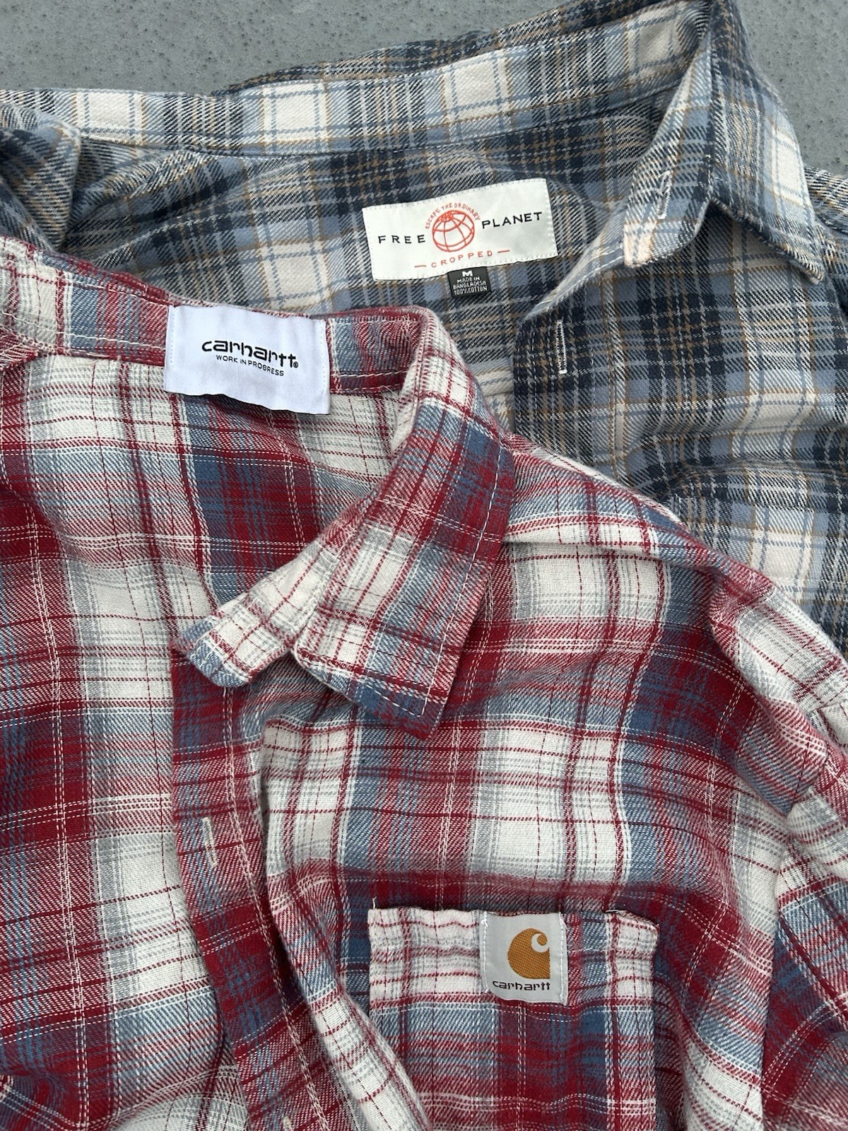 This Vintage Flannel Bundle in size M includes a Carhartt shirt and other pieces, all featuring a classic red plaid pattern in a flannel material. The long sleeve, collared shirts have a button closure and are machine washable. Ideal for casual and workwear occasions, these button-up shirts offer a relaxed fit and come with pockets for added functionality. Perfect for the winter, fall, and spring seasons, these shirts are a stylish and comfortable addition to any man's wardrobe.