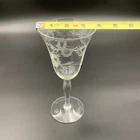 Vintage glass wine and water goblet featuring a cut floral design on the bowl and base with a bulbous stem, measuring 7 3/4 inches. The goblet is in very good vintage condition. We strive to show an accurate portrayal of our items. The item will be shipped the same or next day. Please feel free to contact us with questions or requests. If for any reason that you are not satisfied with our item, please note that we accept returns. Take care and thank you for viewing our listing.