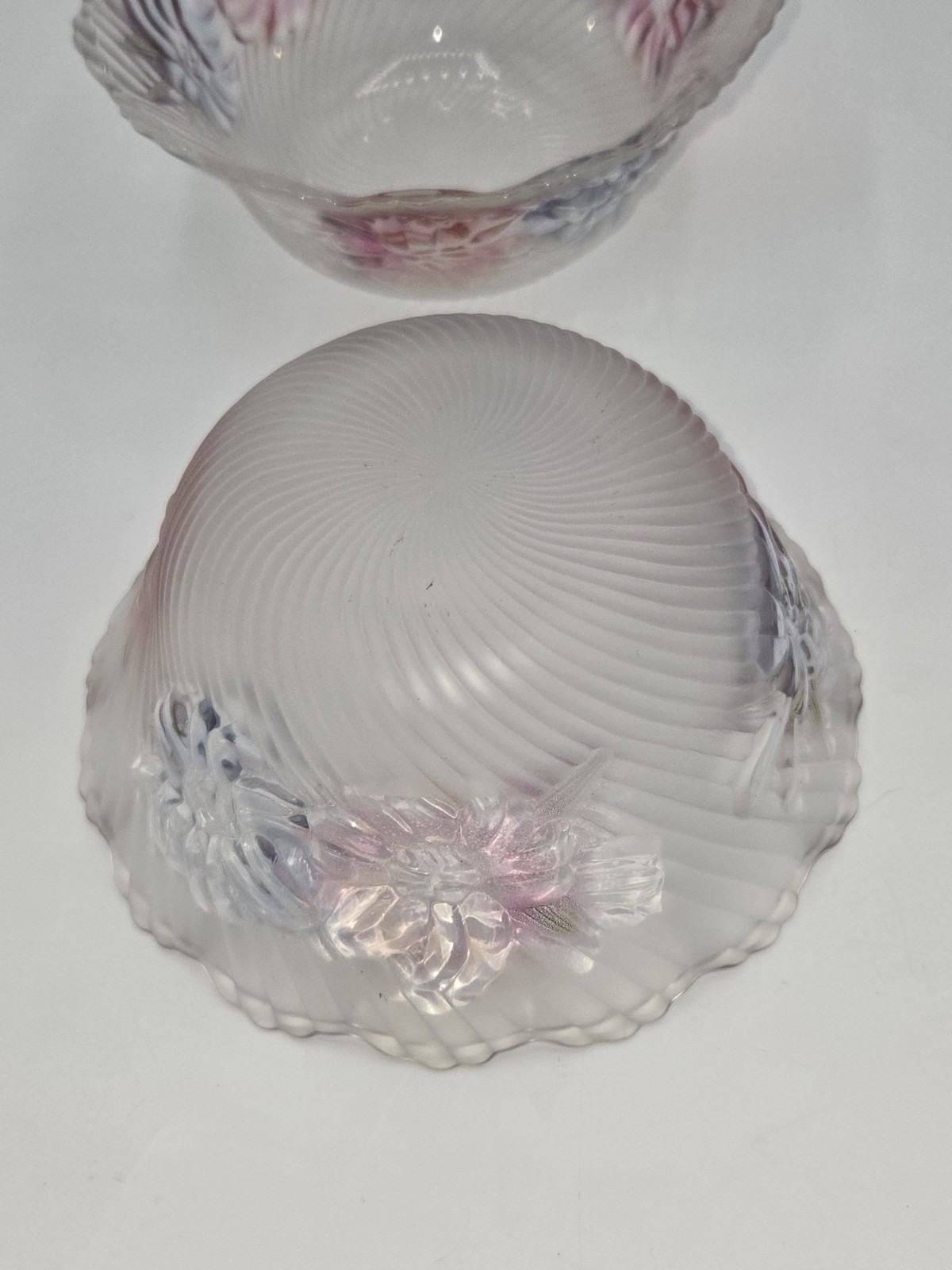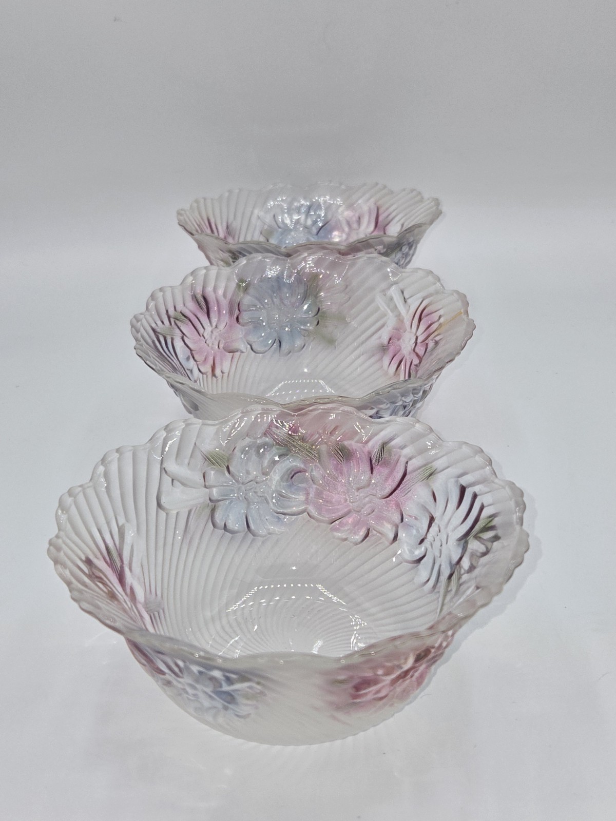 Add a touch of vintage elegance to your dinner table with this stunning set of three frosted glass bowls. Featuring a beautiful floral pattern, these bowls are perfect for any occasion. Crafted from high-quality glass, they are durable and long-lasting. The set includes three bowls, each of which is perfect for serving your favorite meals. The unmarked brand ensures that you are getting a quality product that will last for years to come. Whether you are hosting a formal dinner party or a casual get-together with friends, these bowls are sure to impress.