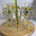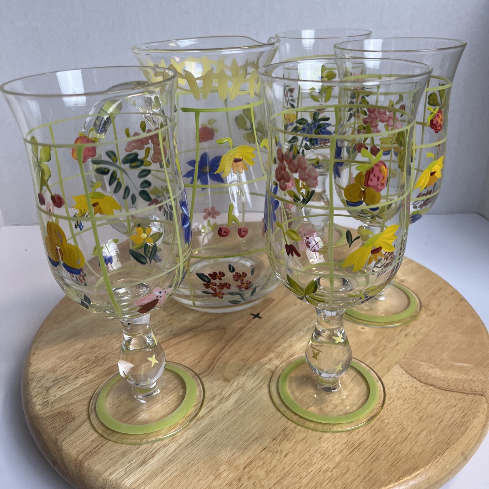 Vintage Pitcher & 4 Stemmed Glasses Hand Painted Flowers Summer Cottage Core. Great for wine, lemonade, ice tea, any summer drinks