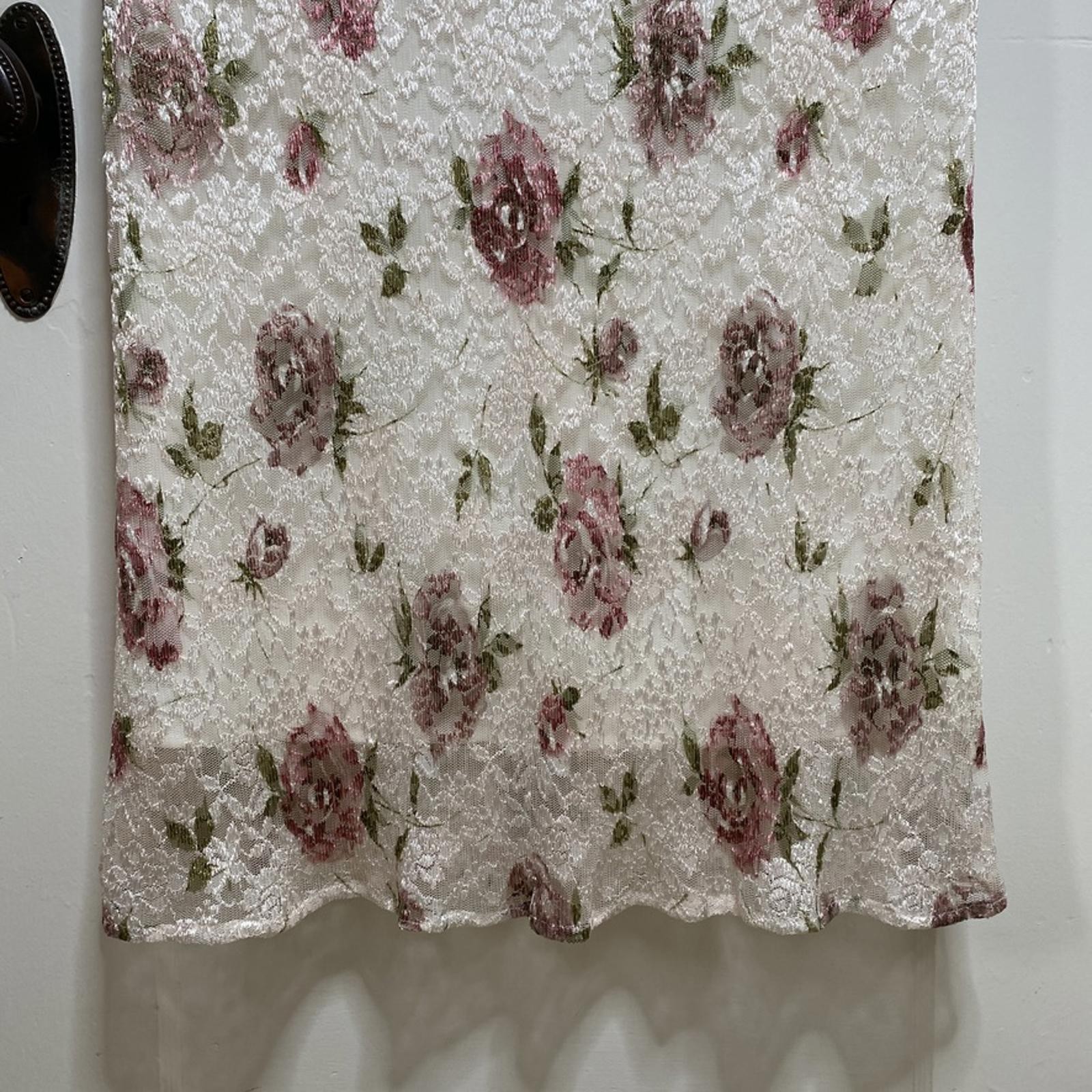 This stunning floral lace midi skirt features delicate pink roses and has a hand sewn waist, making it perfect for DIY, costumes, or cosplay. BRAND: N/A CONDITION: Good Used, has hand sewn waistband US SIZE: Medium | Waist 28" Length 37" Lining 33" COLOR: Cream white, pink, green MATERIAL: Polyester (no tags) FEATURES/ACCENTS: - Made from lovely stretchy lace - Rose floral design - Midi length for a sophisticated look - Versatile for both casual and formal wear ABOUT ME: I accept reasonable offers. Same or next day shipping. Questions? I’m always here to help with sizing, styling, or other inquiries. Thanks for stopping by! Have a great day. 😻ClosetKitty23 80s Y2K Bohemian Botanical Coquette Cosplay Cottagecore Dainty Fairycore Feminine Going Out Maximalist Prom Retro Romantic Roses Vintage