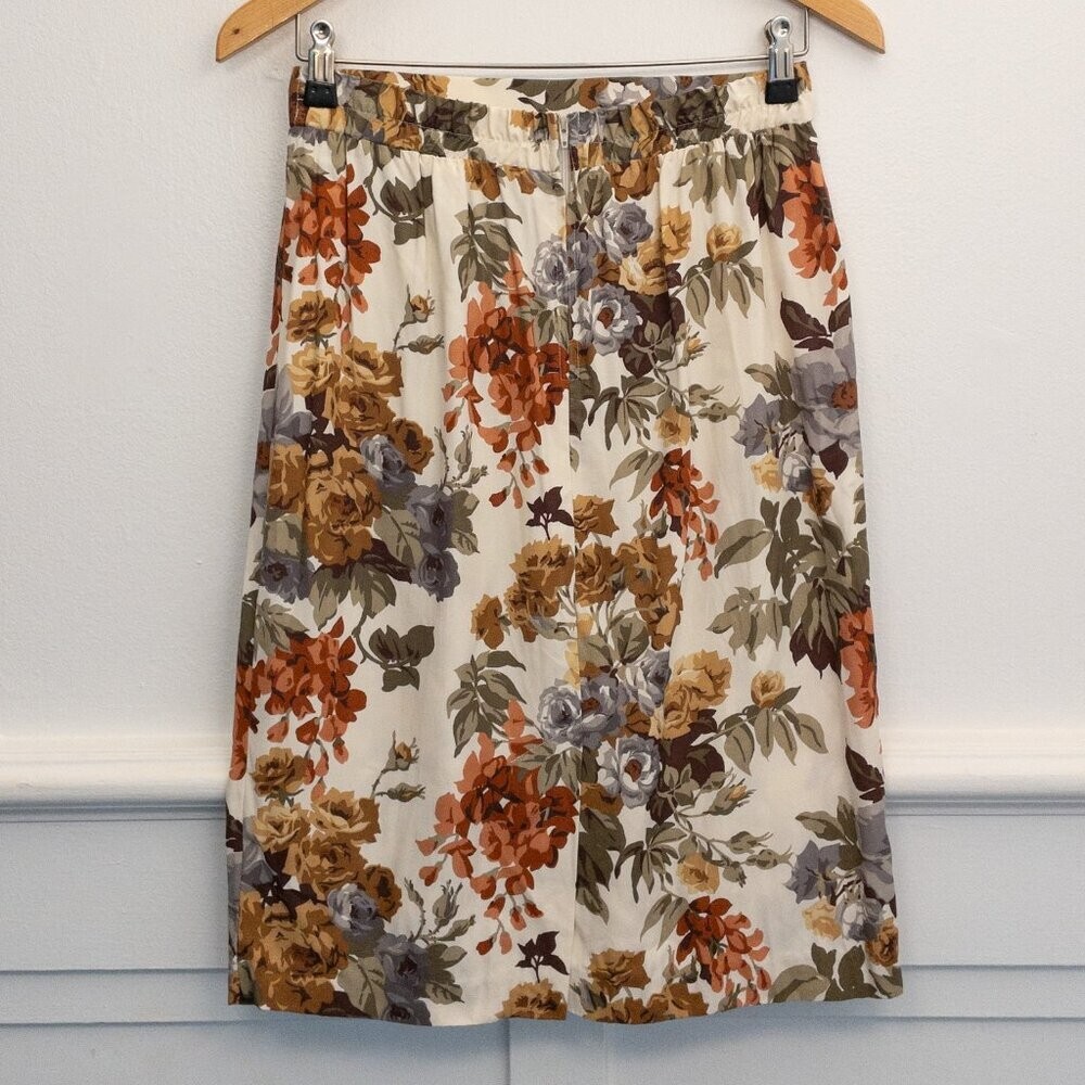 This vintage floral midi skirt features a timeless botanical print in warm, earthy tones—perfect for fall or spring styling. Made in the USA, it’s crafted from 100% rayon for a soft, breathable feel and offers gentle pleats for subtle volume. Elastic waistband in the back ensures a comfortable and flexible fit. A great choice for vintage lovers, cottagecore aesthetics, or those looking for a romantic yet wearable skirt. Ideal for casual days, farmers' markets, brunch dates, or weekend outings. ✔️ Made in the USA ✔️ 100% rayon shell with acetate-rayon blend lining ✔️ Elastic waistband (back only) ✔️ Pleated front for a flattering silhouette ✔️ Mid-length with flowy drape ✔️ Dry clean only ✔️ No flaws noted ✔️ Best for vintage, boho, and romantic wardrobes Measurements laying flat: Waist: 13.5". Length: 25" Offers welcomed! #VintageStyle #MadeInUSA #Cottagecore #BohoStyle #MidiSkirt #FallFashion #FloralSkirt #RomanticStyle