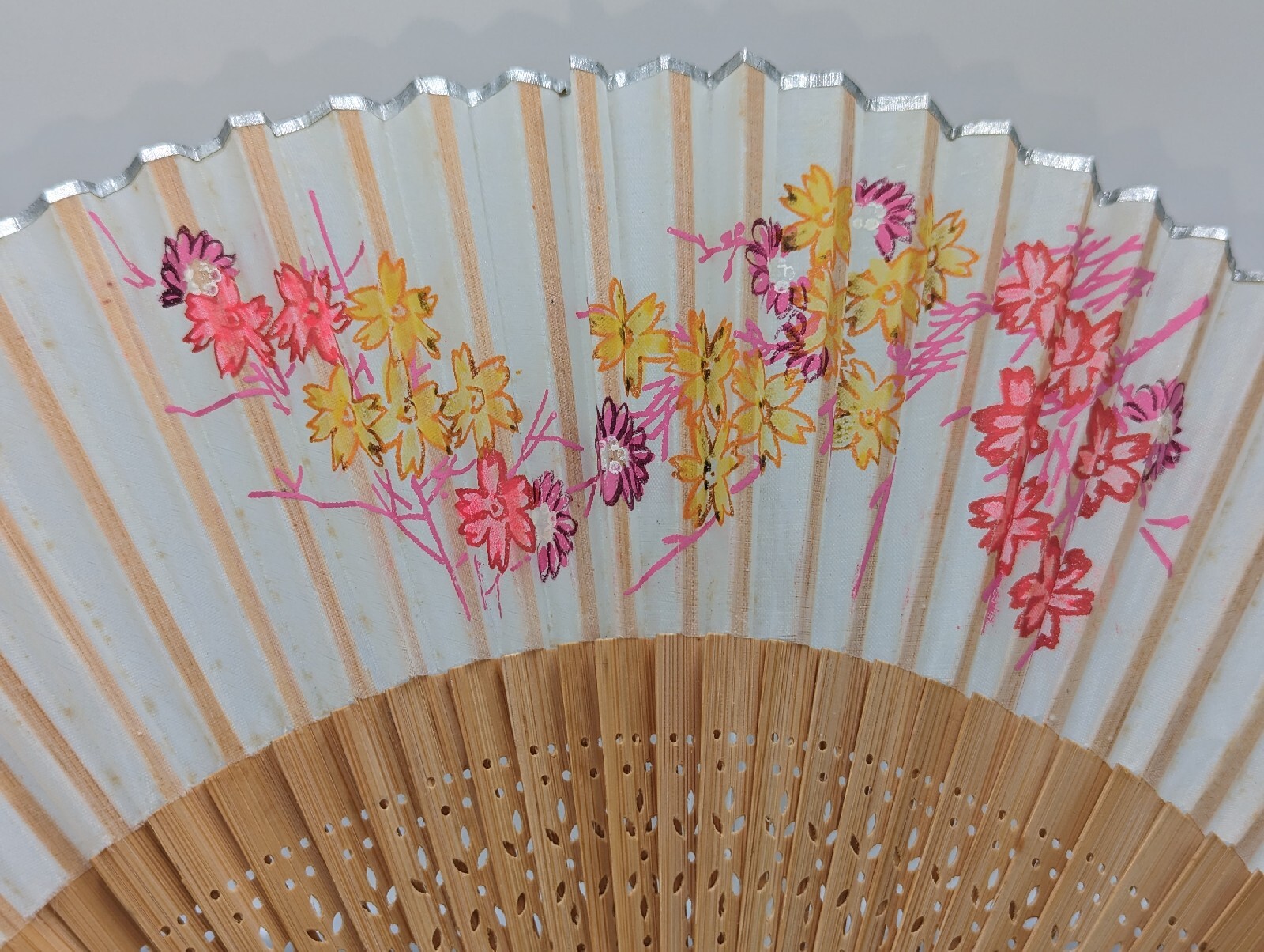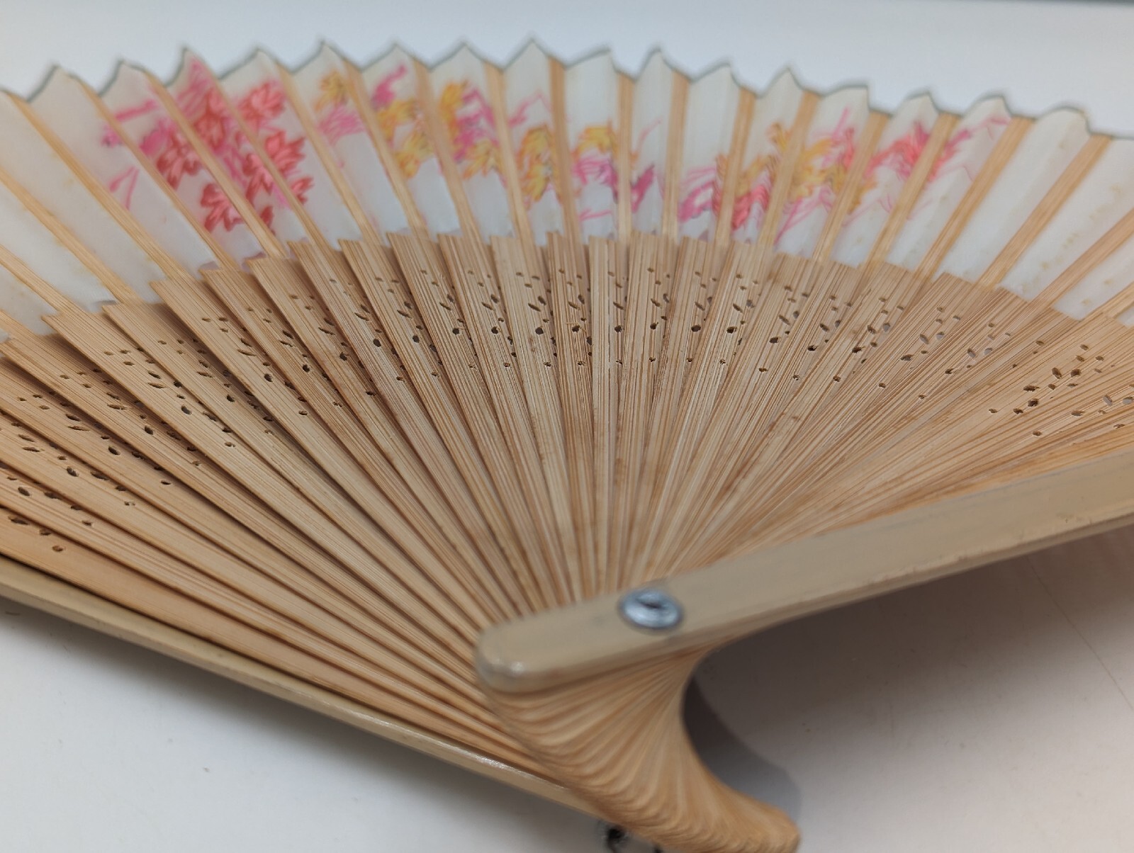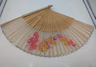 Vintage Folding Hand Fan Asian Style Fabric & Pierced Bamboo Floral Design 9". Very good considering the age. There is a small amount of wear, which should be expected, but no tears or breaks. The hand painted floral design is purple, pink and yellow on an ivory-colored background. There is silver trim along the top of the fan. The bamboo sticks are pierced with an intricate design. The silver-colored rivet has a small ring or loop. The fan still opens and closes very nicely. All of my items are carefully packed for shipping, no matter their value - $5 items are wrapped with the same care as a $200 item. My goal is to have your purchase arrive safely. Large, heavy and fragile items are harder to use combined shipping with but just ask if you would like to purchase more than one item and I am more than happy to do so if feasible. Measurements are approximate or as close as I can get. Also, the color you see many not be the exact color depending on your computer or phone settings. Unpaid items will result in the buyer being blocked from further purchases. Please remit payment right away so we can get your item shipped out quickly.