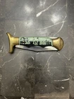 This vintage pocket knife features a unique carnival festival scene on the handle and is manufactured in Pakistan. The knife has a single plain blade made of stainless steel and a handle crafted from brass. The knife is a classic model that is perfect for collectors and enthusiasts alike. It has been well-maintained and is in great condition, ready for use or display.