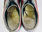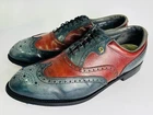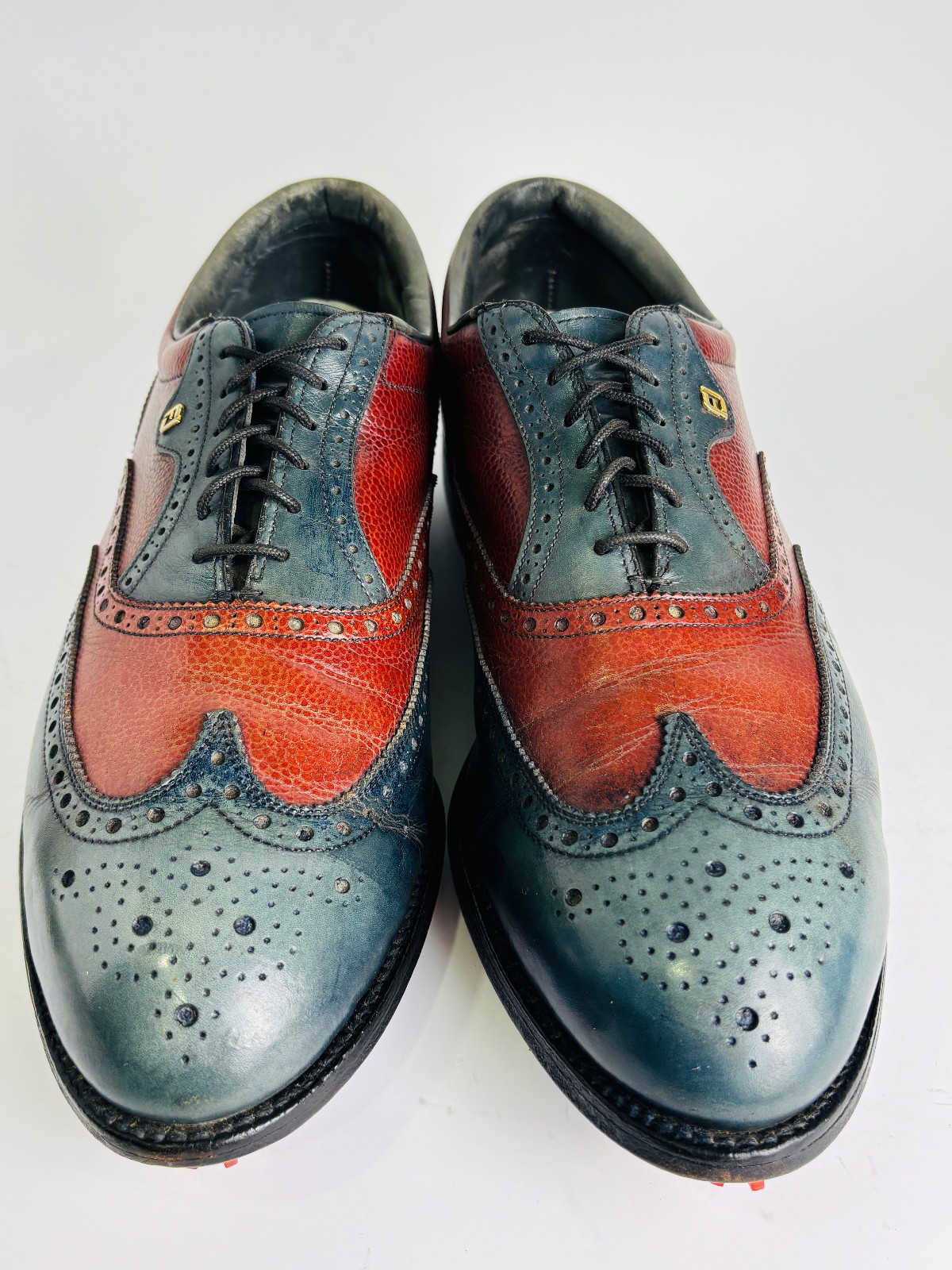 Offered here is a rare and collectible pair of vintage FootJoy wingtip golf shoes , size 11.5 D , proudly Made in the USA . These two-tone leather classics feature bold red pebble-grain panels contrasted with deep blue smooth leather, full brogue detailing, and new soft spikes. These shoes were crafted during the golden era of FootJoy manufacturing, when every pair was hand-finished in their Brockton, Massachusetts facility. That factory closed in 2008, marking the end of U.S.-made FootJoy footwear — making surviving pairs like these truly scarce. FootJoy has long been considered the gold standard in golf footwear, worn by legends such as Jack Nicklaus, Tom Watson, and Payne Stewart . Vintage USA-made FootJoys are highly sought after by collectors and golfers who appreciate their superior craftsmanship, premium leather, and timeless style. With the supply permanently capped, values for well-preserved examples are only expected to rise. Condition : Very good vintage condition overall. The uppers are supple and retain rich color. There is a small rip in the heel counter (photographed) that has been sealed with cement and clear tape for stability, but it will need a proper repair for long-term wear. Spikes and soles are in excellent shape. Details: Brand: FootJoy Size: 11.5 D Color: Red pebble-grain & blue smooth leather two-tone Style: Wingtip full brogue golf shoes Made in USA – Brockton, Massachusetts factory (now closed) new matching soft spikes Collectible vintage golf footwear Why These Matter: FootJoy’s American-made shoes were built to a standard rarely seen today. The leather quality, hand-finishing, and Goodyear welt construction made them not only high-performance on the course but also durable enough to last decades. With production moved overseas and the U.S. factory gone, vintage models like these represent a piece of golf history — both wearable and highly collectible.