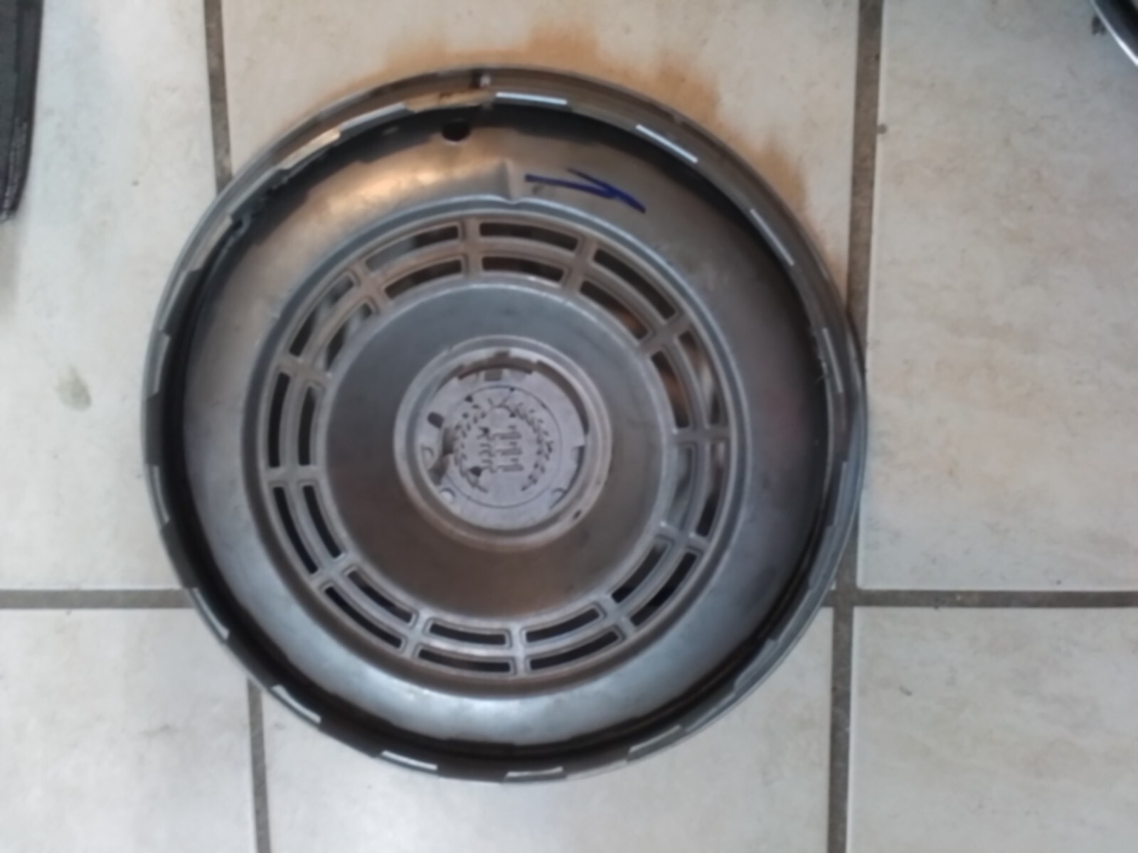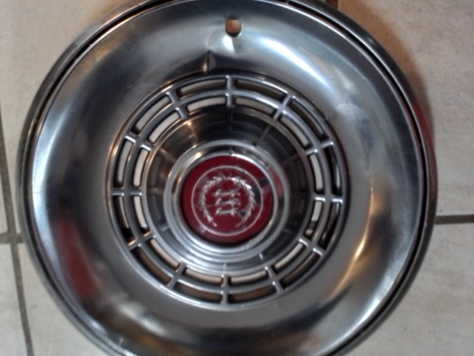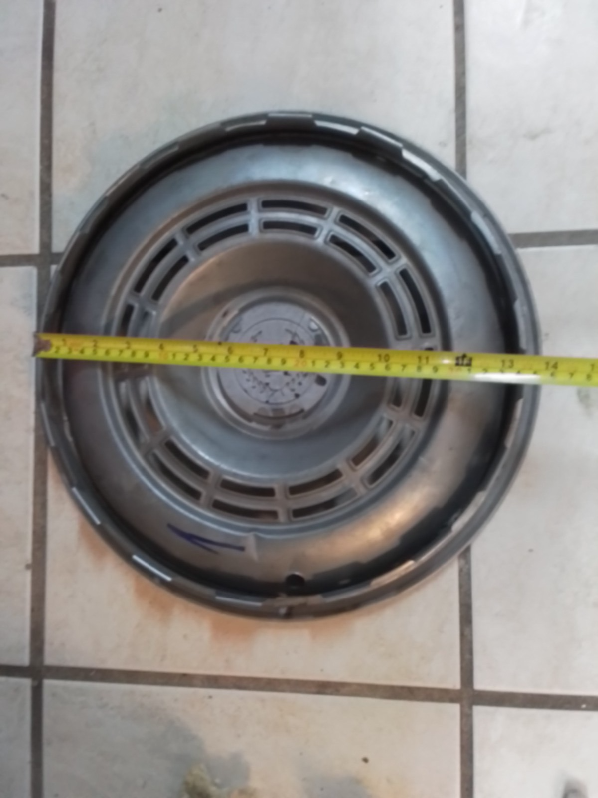 Measures from edge to edge is 15 1/4". Had few small dents. The center logo, the red plastic had cracks. Nice looking hubcap.
