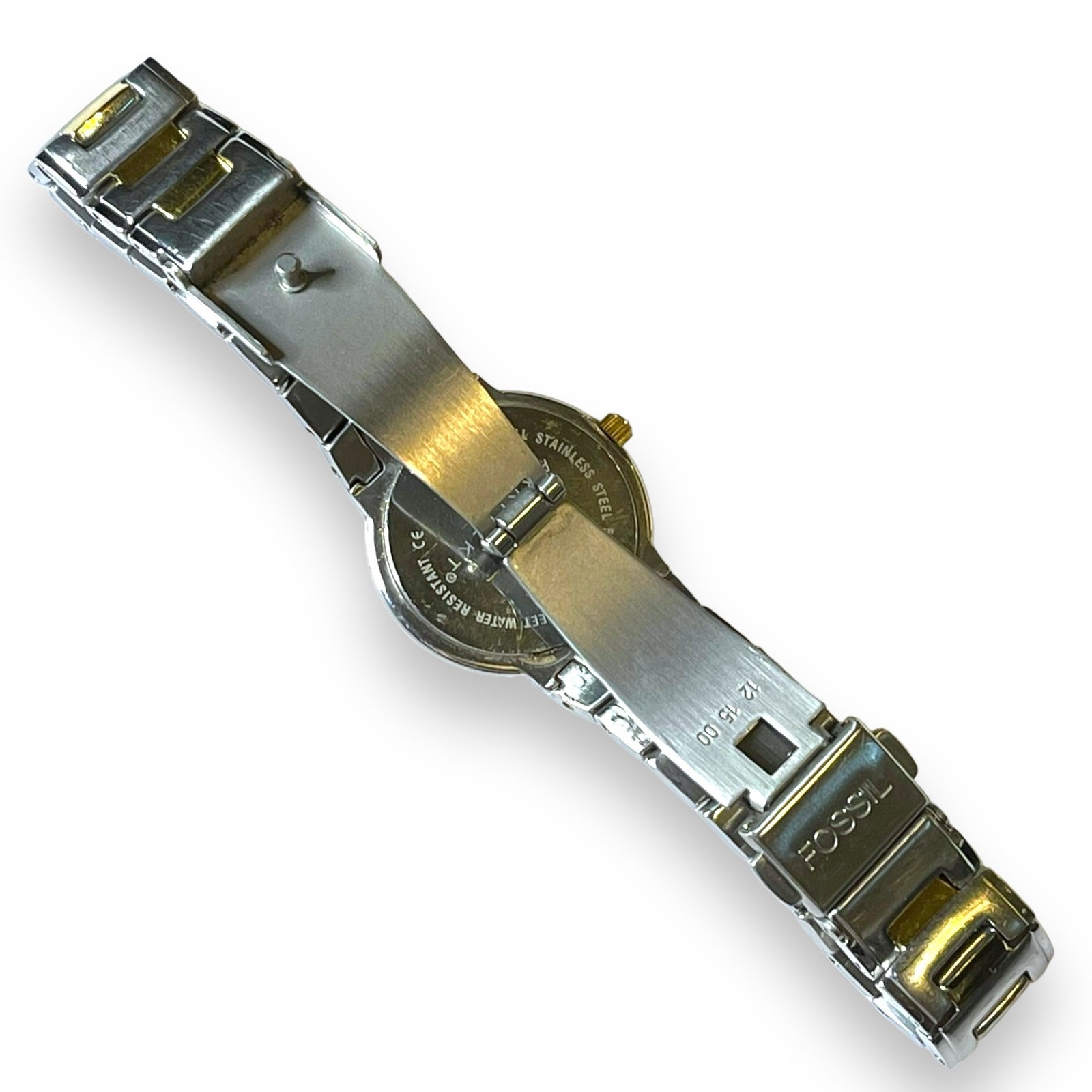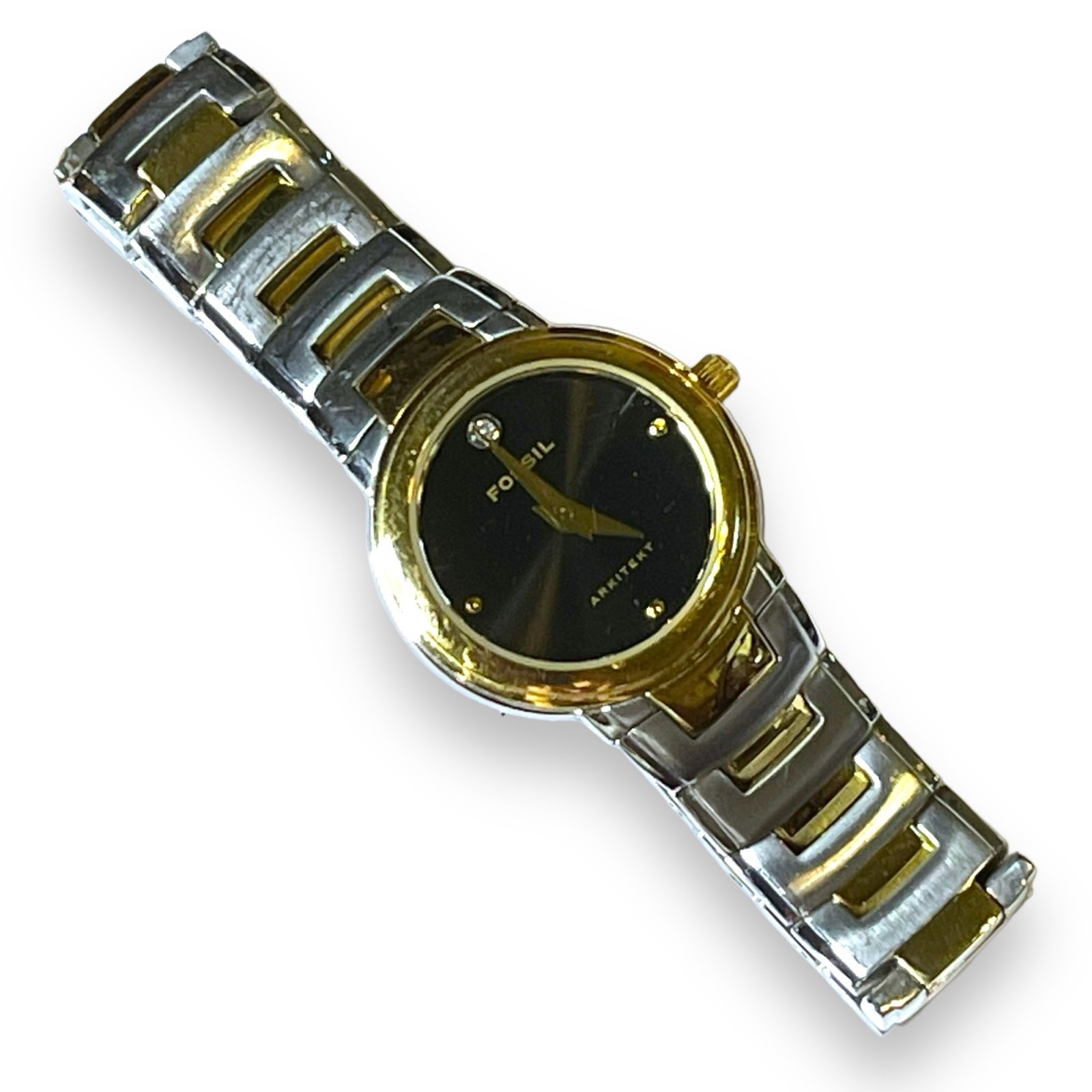 Vintage Fossil Watch Womens Arkitekt Two Tone Stainless Steel Black Dial Rhinestone WORKS Elevate your style with this stunning vintage Fossil watch. Crafted from stainless steel and featuring a black dial adorned with a singular rhinestone, this two-tone watch exudes elegance and sophistication. Perfect for everyday wear or special occasions, it also comes in working condition. The watch is in good vintage condition and ready to wear. There are scratches on the crystal and body. The watch is in working condition.