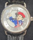 This Fossil Limited Edition News Boy Watch is a vintage piece with a silver bezel and a two-piece black leather strap. The watch has a round shape and an analog display with a white dial color. It was manufactured in Japan and has a reference number of LE9490. The watch comes with its original box and packaging, and is customized with no changes made. It is a unisex adult watch that is perfect for casual wear. The movement is quartz, and the watch has a unique vintage style that is sure to catch everyone's attention.