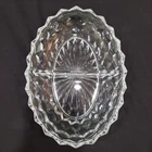 This vintage Fostoria American Clear Glass Divided Dish features an elegant oval shape with a geometric design, measuring 10 inches in diameter and 2 inches in height. Made of clear glass, this dish was manufactured in the United States as part of the American Clear product line. The Fostoria brand is known for its elegant glassware, making this item a stylish and vintage piece for serving various dips or snacks.