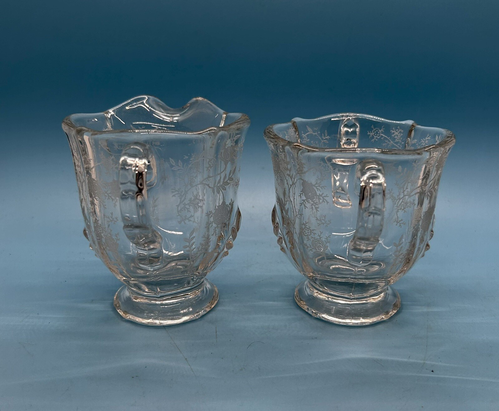 This vintage Fostoria cream and sugar set, model #2496, is a charming addition to any collection. The delicate chintz style adds a touch of elegance. The footed open sugar bowl and creamer set is perfect for serving at a formal dinner or casual afternoon tea with friends. The brand has a well-established reputation for producing high-quality glassware. The set is a must-have for collectors and lovers of vintage glassware. X/17/8/23