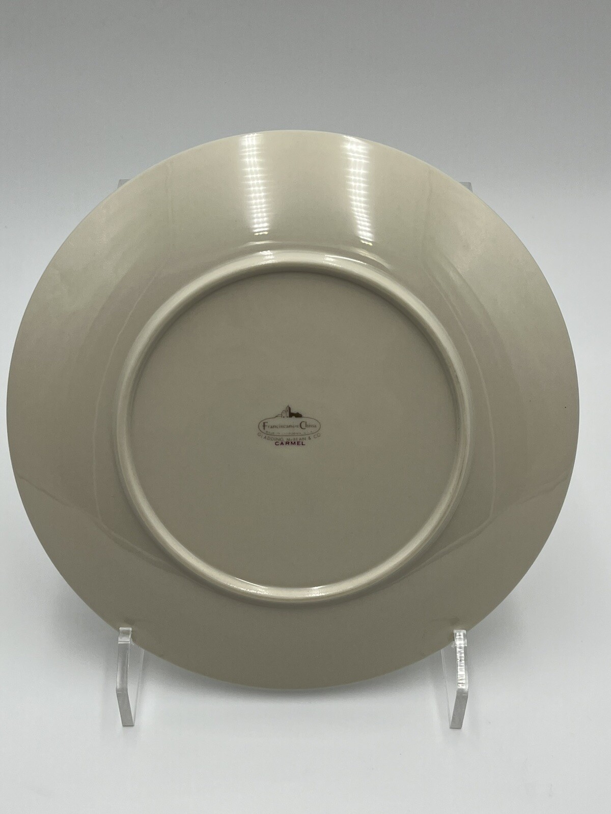 Finish:GlossyFeatures:Silver trimOriginal/Reproduction:Vintage OriginalNumber of Items in Set:Eight-pieceShape:Roundgtin13:Does not applyHandmade:NoUPC:Does not applyPlate Diameter:8 inType:Salad PlateOccasion:All OccasionsProduction Style:Elegant GlassOrigin:CaliforniaColor:IvoryManufacturer Warranty:noneOriginal/Licensed Reproduction:OriginalProduct Line:CarmelCountry/Region of Manufacture:United StatesStyle:Mid-Century ModernPattern:CarmelTheme:FloralAntique:NoBackstamp:PrintedMaterial:PorcelainSet Includes:Salad PlateCare Instructions:Hand Wash OnlyProduction Technique:PotteryDepartment:AdultTime Period Manufactured:1950-1959Brand:FranciscanEra:Mid 20th Century (1941-1969)Vintage:Yes
