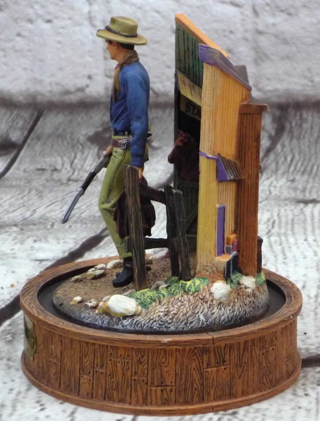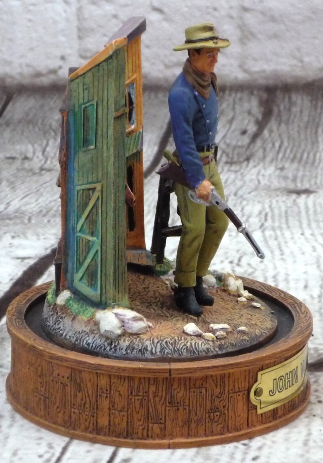 Vintage Franklin Mint John Wayne With Glass Domed - Shotgun Stable Palace This vintage Franklin Mint sculpture features the iconic John Wayne as a cowboy with a shotgun in a glass domed stable palace. The piece is hand-painted and a limited edition, making it a valuable addition to any collection. The cowboy theme and 1950s style make it perfect for all occasions and any room in the house. The sculpture stands at 6 inches tall and is made of high-quality glass material. No additional parts are required for display. This original piece is a must-have for fans of John Wayne and cowboy memorabilia. Add it to your collection today! Our Fun and Friendly Policies Customer Happiness is Our Priority: We're all about making you smile! If your purchase doesn't put a grin on your face, let us know. Your satisfaction is our mission, and we're here to make it happen. Fast Shipping, Happy Waiting: We're like a lightning bolt in the shipping world! Most orders zoom out within 1-2 business days of payment. Get ready to track your parcel's speedy journey to you. Return Cheers: Need to send something back? No worries! We're here to help with the return magic. Just remember, like a friendly handshake, you're responsible for the return shipping. Spreading Positivity: Your support means the world to us! Join our community of good vibes. Share your thoughts, leave feedback, and be part of our journey to keep the positivity flowing. Talk to Us, We're All Ears: Got questions, ideas, or just want to chat? We're all ears and ready to connect. Reach out through eBay's messaging, and expect a friendly response from our side! Your happiness is our driving force. Thanks for choosing us and letting us be part of your good times!