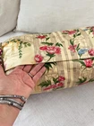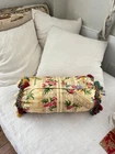 Welcome to The Textile Trunk ~ Thank you for over 25 wonderful years of helping bring these beautiful antique textiles and decorative items to life again! This fabulous vintage bolster cushion was made using a gorgeous century French chinoiserie cotton sateen backed in coordinating fabric and trimmed with the most joyful multi-colored tassels! I'm not sure of the date, perhaps 1980's?? It’s part of a matching set, including two large curtains—if you’d like to see the others, simply search my store for the words Gold Chinoiserie ~ The pattern is absolutely beautiful, with charming garden scenes of pagodas, elegant figures, bamboo trellises, and blooming peonies in shades of rose pink, green, gold, and blue on a soft golden ground. The color palette is rich and cheerful without being overpowering, and the cylindrical shape makes it ideal for a sofa, bench, or bed. The form inside comes with the purchase! It feels like synthetic It has a hidden button closure at the back and is sold as the cover only ~ no insert included, so you can fill it just as you like! These wonderful vintage textiles offer the joy of upcycling and sustainability while adding a touch of timeless French charm to your home! MEASUREMENTS: Approximately 19 inches long by 9 inches across the side and approximately 24 inches around CONDITION: This lovely textile is in as found, not freshly laundered condition. GORGEOUS condition ~ Pillow 201