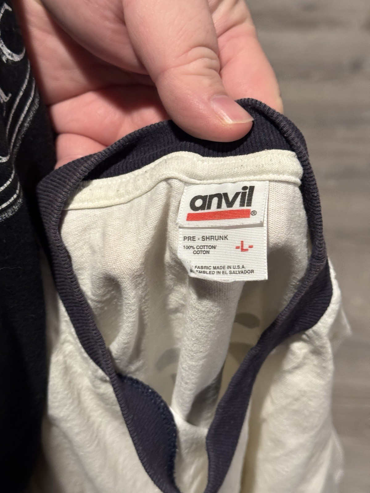 The Vintage Frost Valley YMCA Camp Ringer Shirt in size Large is a classic white t-shirt from the Anvil brand, designed for men. The regular fit and size make it a comfortable and versatile option for everyday wear. Perfect for those who appreciate vintage style and nostalgic pieces in their wardrobe, this shirt is a timeless addition to any collection. Selling as-is