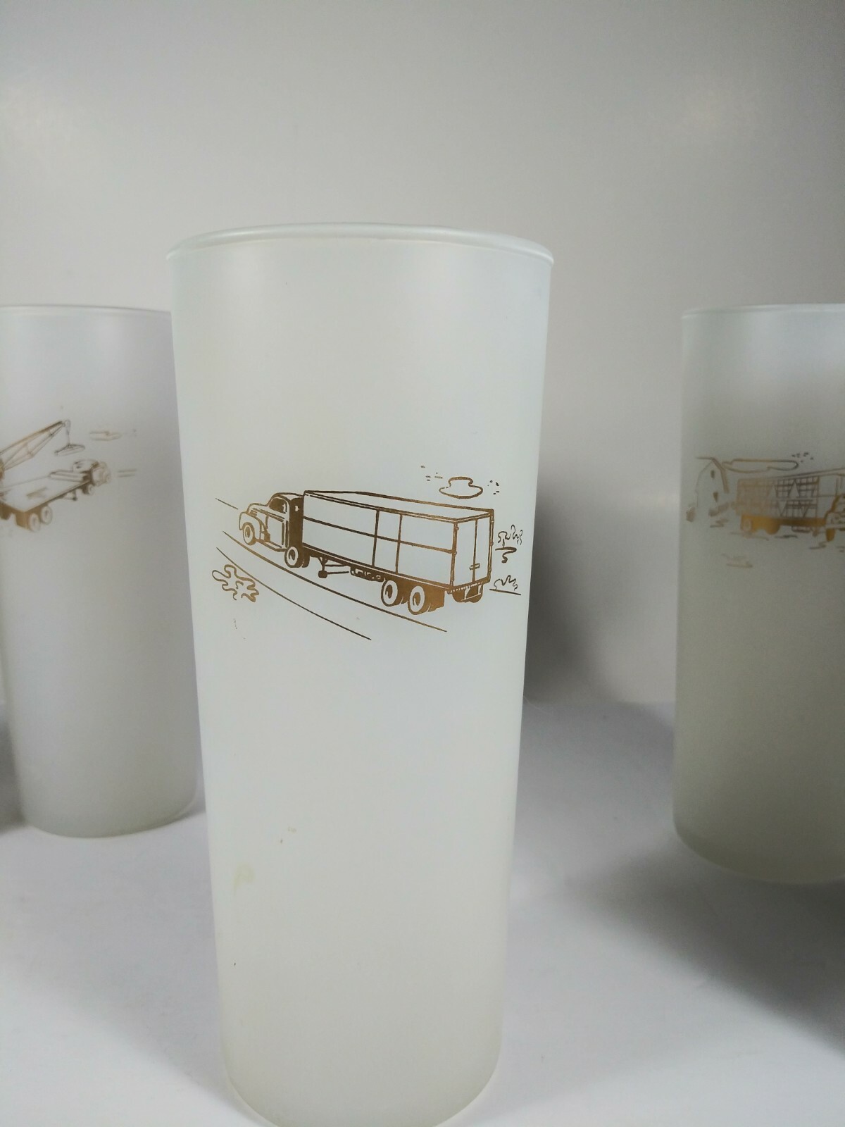 Vintage Frosted Glass White Gold Etching Semi Trailer Crane Set of 6