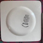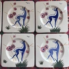 Vintage GIEN France Plates x 6 ANTILOPE Peint À La Main Bread, Tea, Canapé, or Hors D'oeuvre Square Plates Porcelain, Hand Painted with an "Antilope" in the center surrounded by red flowers with one flying bird shape. Circa 1950's Listing is for 2 plates with antilope design Colors: shades of blue, green, red, and deep yellowish-gold Measures approximately: 5.75" square Great vintage condition consistent with age and usage. Slightly rough around outside edges possibly manufacturing flaws. They do not appear to be flea bites. Some crazing on back of plates. One dark back edge of one plate.