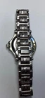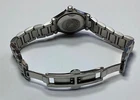 This vintage GUCCI women's watch, model 9040L, features a sleek silver bracelet and dial with stick indexes. The 26mm stainless steel case is water-resistant up to 30m and powered by a quartz movement. With a classic round shape and a date indicator, this stylish timepiece is perfect for formal or casual occasions. The watch also includes a 12-hour dial, central second hand, and a push/pull crown for easy time setting. 1537