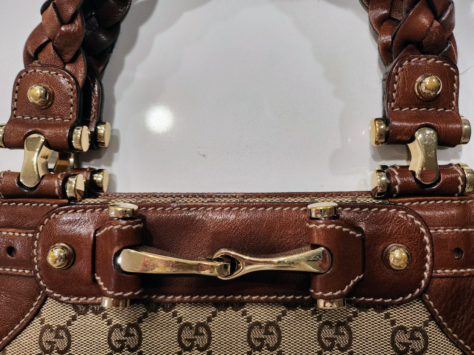 The Gucci GG Monogram Sukey Horsebit Tote in beige and light brown leather with a braided handle is a vintage piece. This tote features double handles with a 5.5-inch drop, gold-plated hardware, bottom studs and a fabric lining with zipper inner pocket. This limited-edition bag comes with its original dust bag. Very Good condition , small scratches on the hardware and leather, some wear on the bottom corners as expected with any well-loved vintage item. The interior is mostly clean with a few spots. Perfect for adding a touch of luxury to any outfit, this stylish tote is a must-have for any fashion-forward woman. Made in Italy. Authenticity guaranteed by eBay.