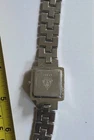 This vintage Gucci ladies watch features a stainless steel strap with a silver buckle closure and a black dial with the Gucci logo pattern. The watch has a square case shape with a silver case colour and a snap caseback. The 12-hour bezel and quartz movement add to its stylish and functional design. This timepiece from the 1980s exudes a casual yet fashionable vibe, making it a unique and elegant accessory for any woman's wrist. With a lug width of 5mm and a case thickness of 10mm, this Gucci watch is a timeless piece that is sure to make a statement.