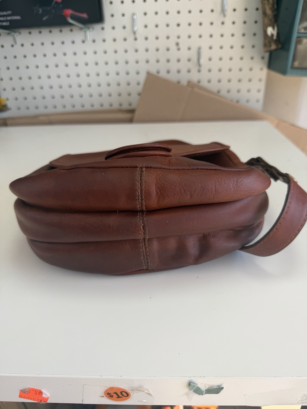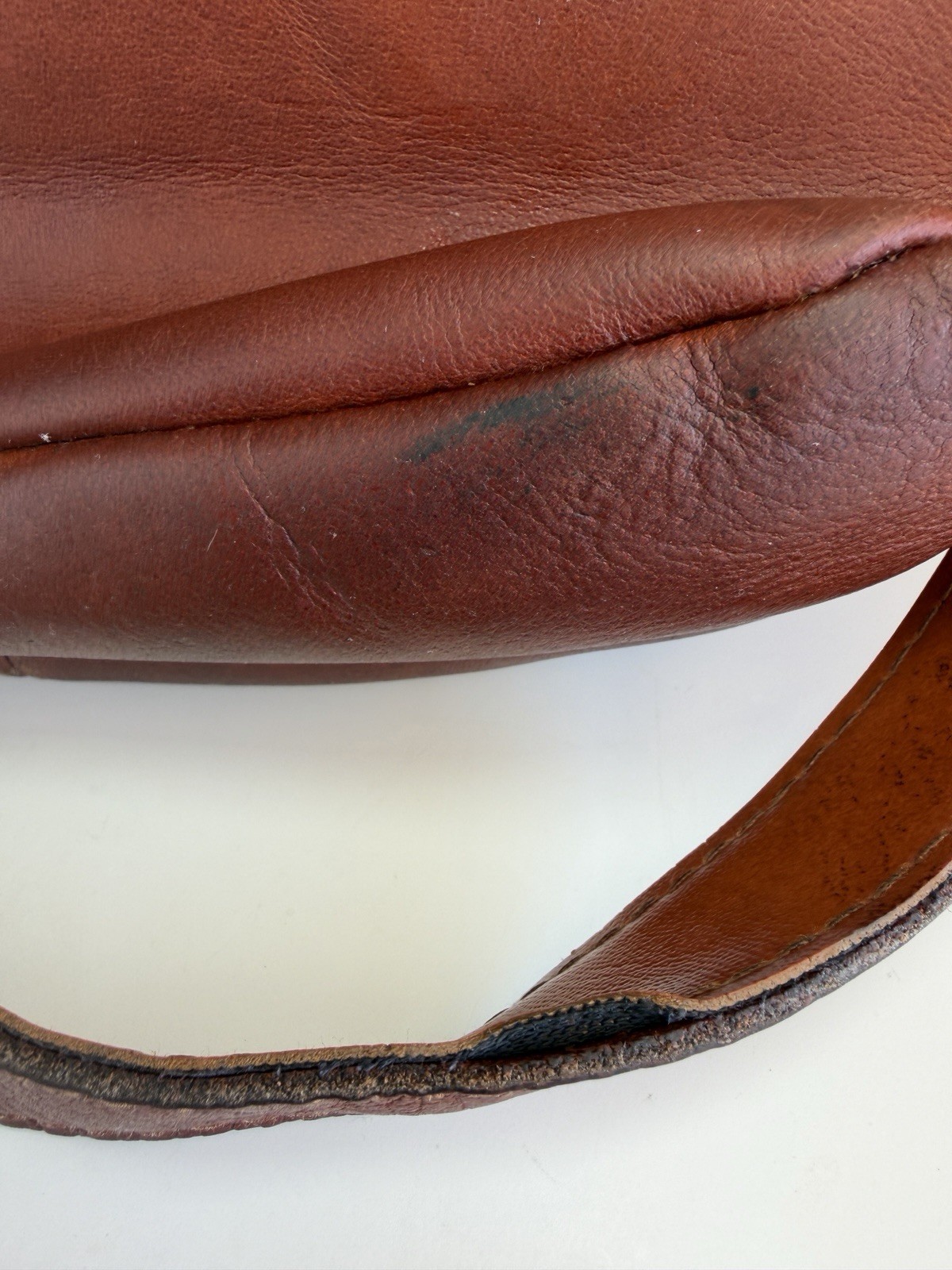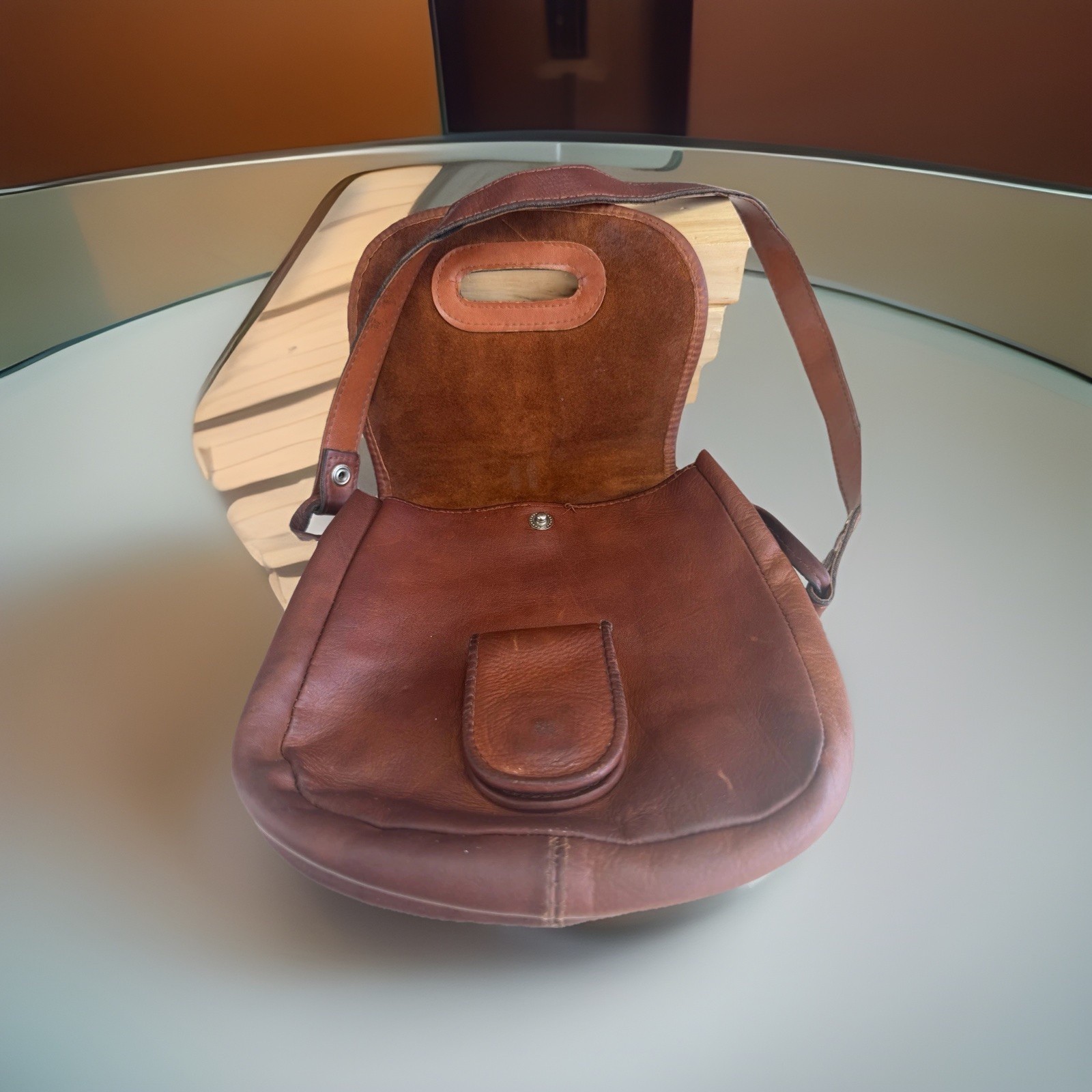 The Vintage Genuine Leather Crossbody Bag in Brown Saddle Cognac is a boho minimalist accessory perfect for women travelers. Made of high-quality leather with a suede lining, this medium-sized bag features a rectangular shape with a snap closure. The brown shoulder strap adds a classic touch to the 80s-themed saddle bag, which is lightweight and crafted in Hong Kong with brass hardware. The distressed finish gives it a unique and stylish look, making it a versatile and timeless addition to any wardrobe.