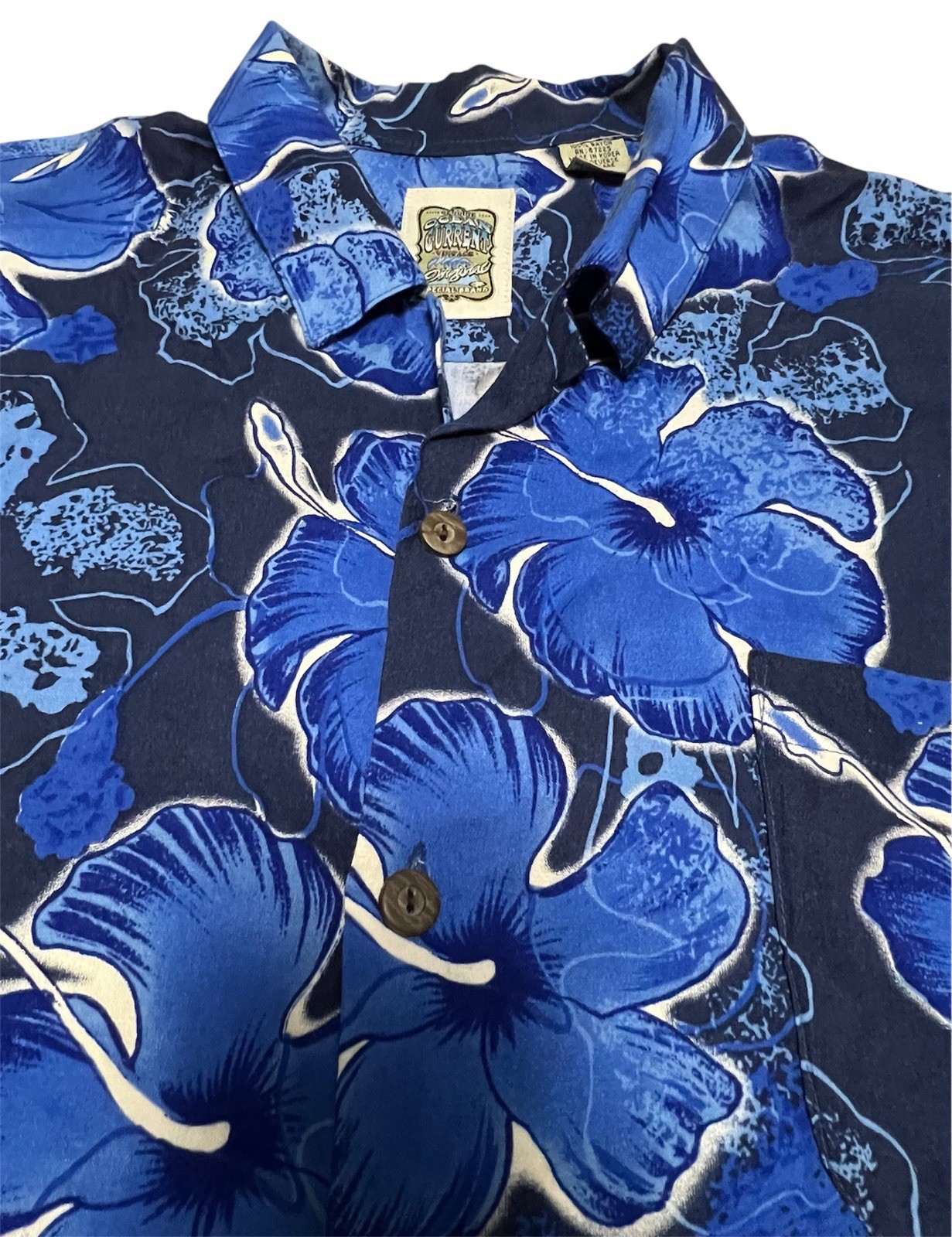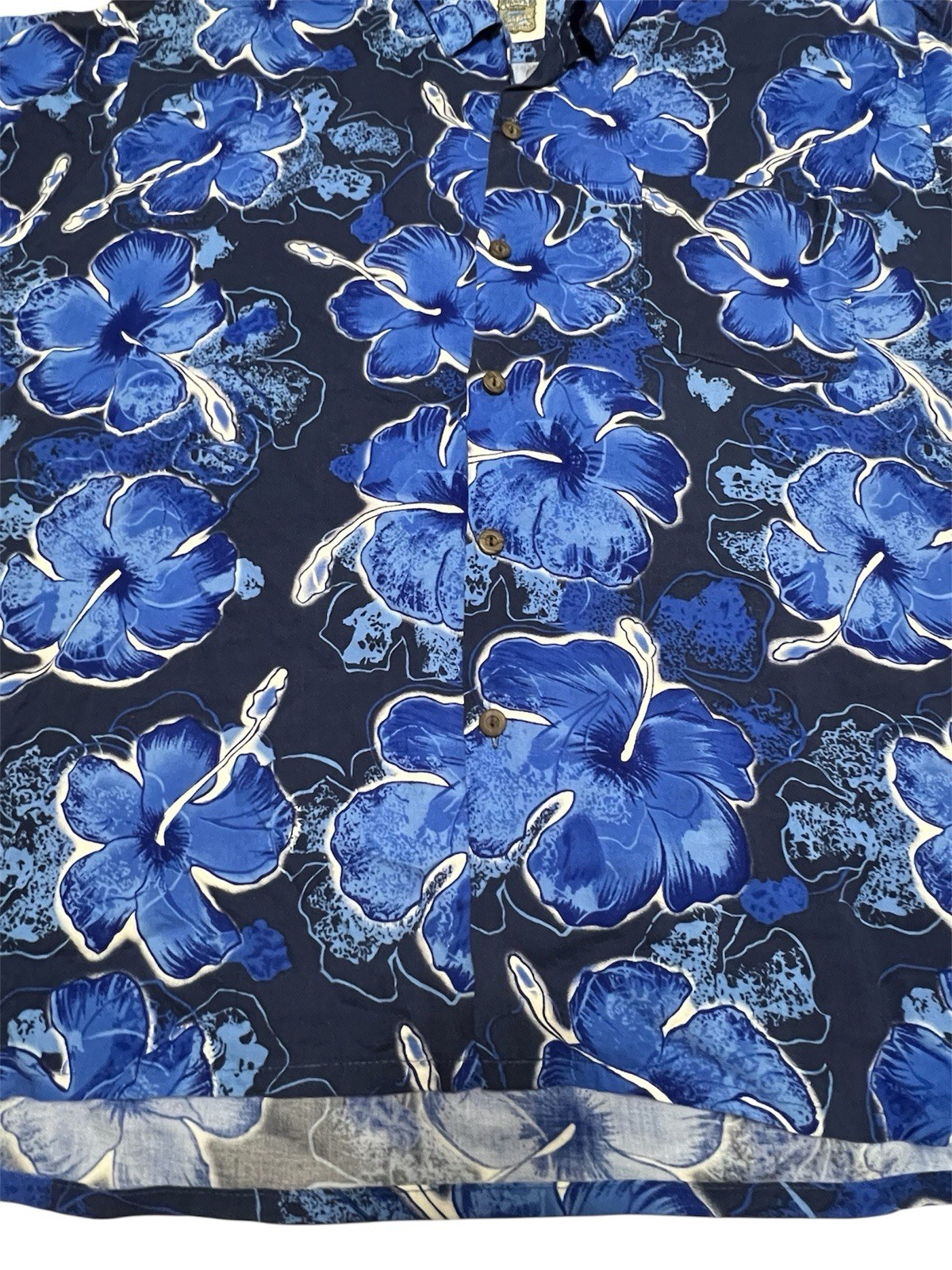 The Vintage Genuine Ocean Current Hawaiian Graphic Shirt is a men's large blue camp shirt made from lightweight rayon fabric. It features a floral Hawaiian theme, short sleeves, a collared neckline, and button closure. The shirt is perfect for travel and casual occasions, with a regular fit and breathable design suitable for summer and spring seasons. The shirt also includes accents like pockets and a point collar style, making it a stylish and comfortable choice for men looking for a vintage-inspired Hawaiian shirt.