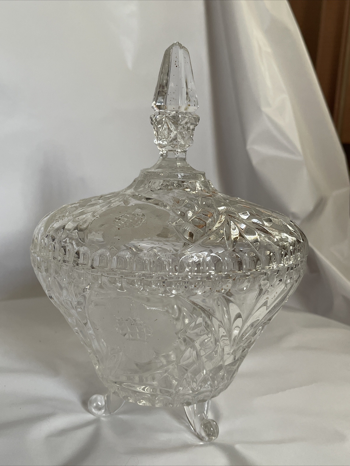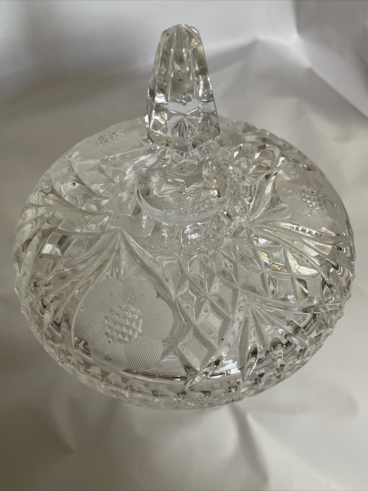 This exquisite candy dish is a genuine lead crystal piece, crafted in West Germany by skilled artisans. The round, clear glass dish measures 6.5 inches in diameter and stands 9 inches tall on its footed base. The intricate cut glass design features a beautiful flower theme, making it a stunning decorative piece that is sure to impress. This candy dish is a vintage original piece, handcrafted with precision and care. It has a single compartment and is lightweight, weighing only 3 pounds and 1 ounce. While it is perfect for serving candies or other small treats, it can also be used as a beautiful centerpiece or decorative item in any home.