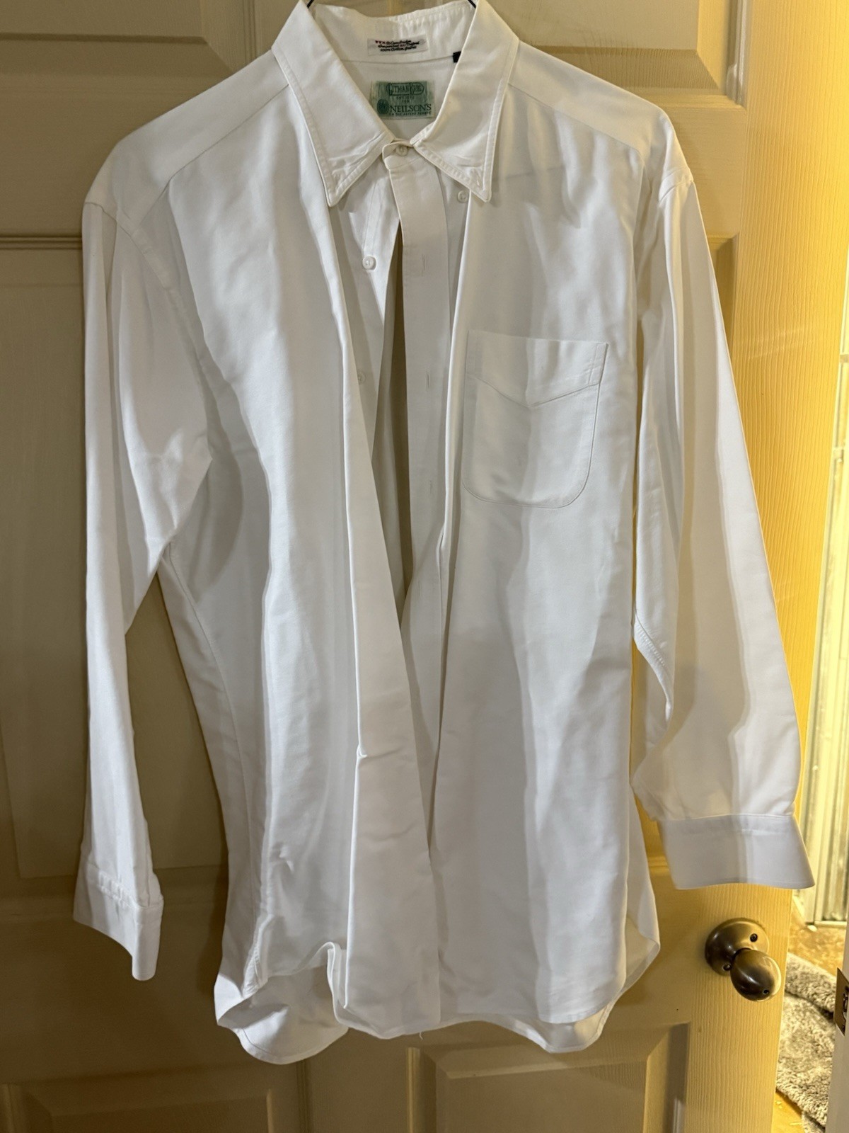 This Vintage Gitman Bros Shirt is a classic men's button-up made in the USA with a Parisian touch. Crafted from Oxford cotton in a solid white color, this shirt features a collared neckline, long sleeves, and a button closure. Perfect for various occasions such as travel, wedding, party, or casual workwear, this shirt has a regular fit and accents with a button detail. Made by the renowned brand Gitman Bros., this timeless and versatile piece is a must-have for any man's wardrobe.