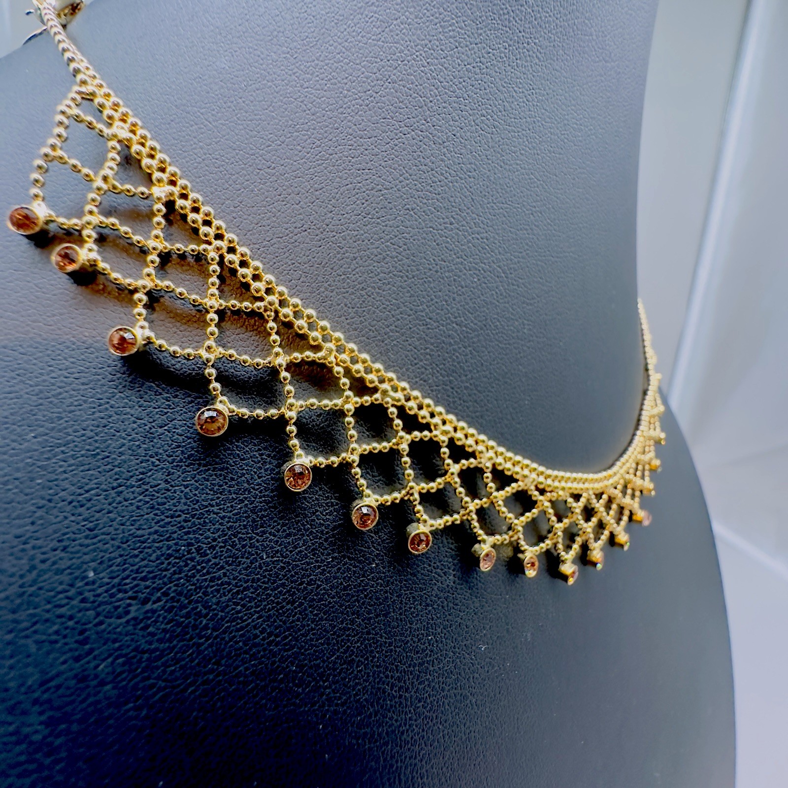Brand:GivenchyStyle:ChokerNecklace Length:17 inMain Stone Color:GoldMaterial:LaceChain Type:Ball/BeadColor:GoldMain Stone Shape:RoundMain Stone:CrystalNumber of Gemstones:26Signed:YesType:NecklaceClosure:Fold Over ClaspDepartment:Women