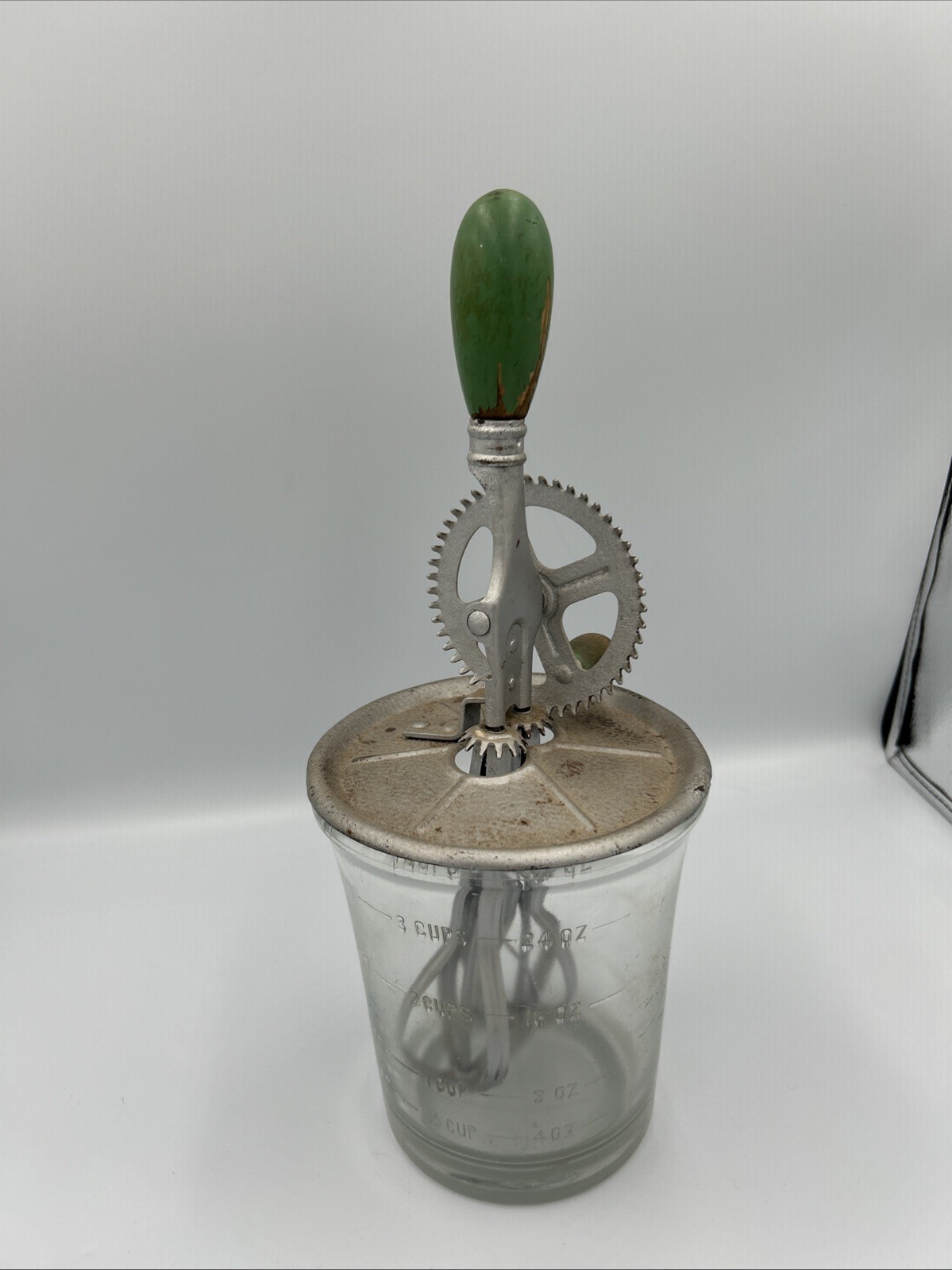 This vintage hand crank egg beater features a clear glass jar with a ribbed pattern, a metal lid with exposed gear mechanism, and a green handle knob. Designed for manual mixing, it reflects classic early kitchenware craftsmanship and makes a great collectible, display piece, or rustic farmhouse décor item. The item is undated, with no visible manufacturer markings or stamped year. The mechanical components appear intact, and the piece shows age-related wear consistent with vintage kitchen tools. Item comes as is. Please review photos before purchase and feel free to ask any questions. Condition Used. Shows visible wear consistent with age, including surface patina and discoloration on metal components. Glass jar appears intact with no major cracks noted. Specifications Item Type: Hand Crank Egg Beater / Mixer Era: Vintage (undated) Material: Glass jar, metal lid and mechanism Handle: Green handle knob Pattern: Ribbed glass Operation: Manual hand crank Features Manual crank-operated mixing mechanism Ribbed glass jar design Exposed metal gear assembly Classic vintage kitchen aesthetic Suitable for display or collection Shipping Ships within 2 business days Carefully packaged Tracking uploaded promptly Smoke-free storage environment Notes Undated vintage item. Surface wear and patina present on metal components. No maker’s marks or production date observed.