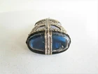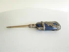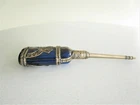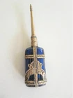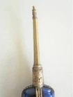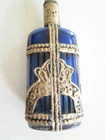 A vintage middle eastern perfume bottle with a metal top and metal accents. Has a mark on the bottom that looks like a wheel. Has 100ml marking and 3.3 fluid oz on bottle. The metal top screws off. Measurement: 10 1/4 inches tall, 2 1/2 inches long, almost 1 1/2 inches wide. Condition: There's scratches to the surface. The metal has a patina. Bottle is empty. The bottle does not stand flush. It's a bit wobbly.
