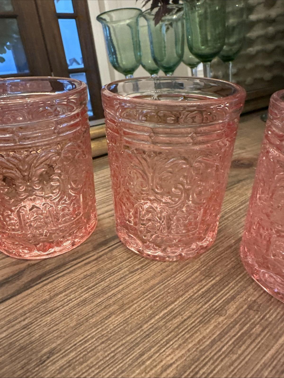 The product is a set of four pink old-fashioned crystal glasses called "Jax" by Godinger. These cocktail glasses have a capacity of 11 oz and are made of crystal. They are designed for all occasions and can be gifted. The elegant pink color adds a touch of sophistication to any drinkware collection, making them perfect for serving cocktails in style. Absolutely beautiful glasses! Excellent condition, no chips or cracks! Please see all photos.