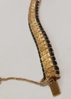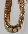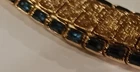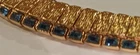 Beautifully radiant gold-plated bracelet set with faceted brilliant blue sapphires. It has s lide in closure along with a small chain at the end for extra security. It features two continuous lines of sapphires -- totaling 78 gems with 39 bordering each side of the textured gold-tone flexible band finish. The style is known for its classic, elegant design that can be dressed up or down, making it suitable for both everyday wear and special occasions. It's a versatile piece that can complement a variety of outfits and personal styles. DIMENSIONS (as shown in photos):\ Nearly 7 inches long [6.625 inches] Over a 1/3 of an inch wide [0.375 inches] Approximately 1/8 of an inch deep [0.1875 inches] The bracelet presents a style of… Continuous Line of Sparkle : ~ Dazzling gems embraced by rich gold. Flexible and Secure : ~ The bracelet's design allows it to drape comfortably around the wrist while maintaining a secure clasp with an additional small chain link for extra protection against loss. Adaptable to Style : ~ Tennis bracelets can be paired with casual jeans and a t-shirt or a formal gown, making them a versatile accessory. Timeless Elegance : ~ The classic design transcends trends, making it a piece that can be enjoyed for years to come. Subtle Sophistication : ~ It's a piece that whispers elegance rather than shouting for attention, appealing to those who appreciate refined style. Luxury and Opulence : ~ While understated, the tennis bracelet often signifies luxury and a taste for fine things. The name "tennis bracelet" itself originates from a memorable incident during a tennis match where the professional tennis player Chris Evert's diamond bracelet broke and was lost during play. 😉 The pictures tell the whole story and show the bracelet’s luxurious fashion! Note that the photos lack the true clarity of the brilliant blue stones. [A photographer I’m not.]