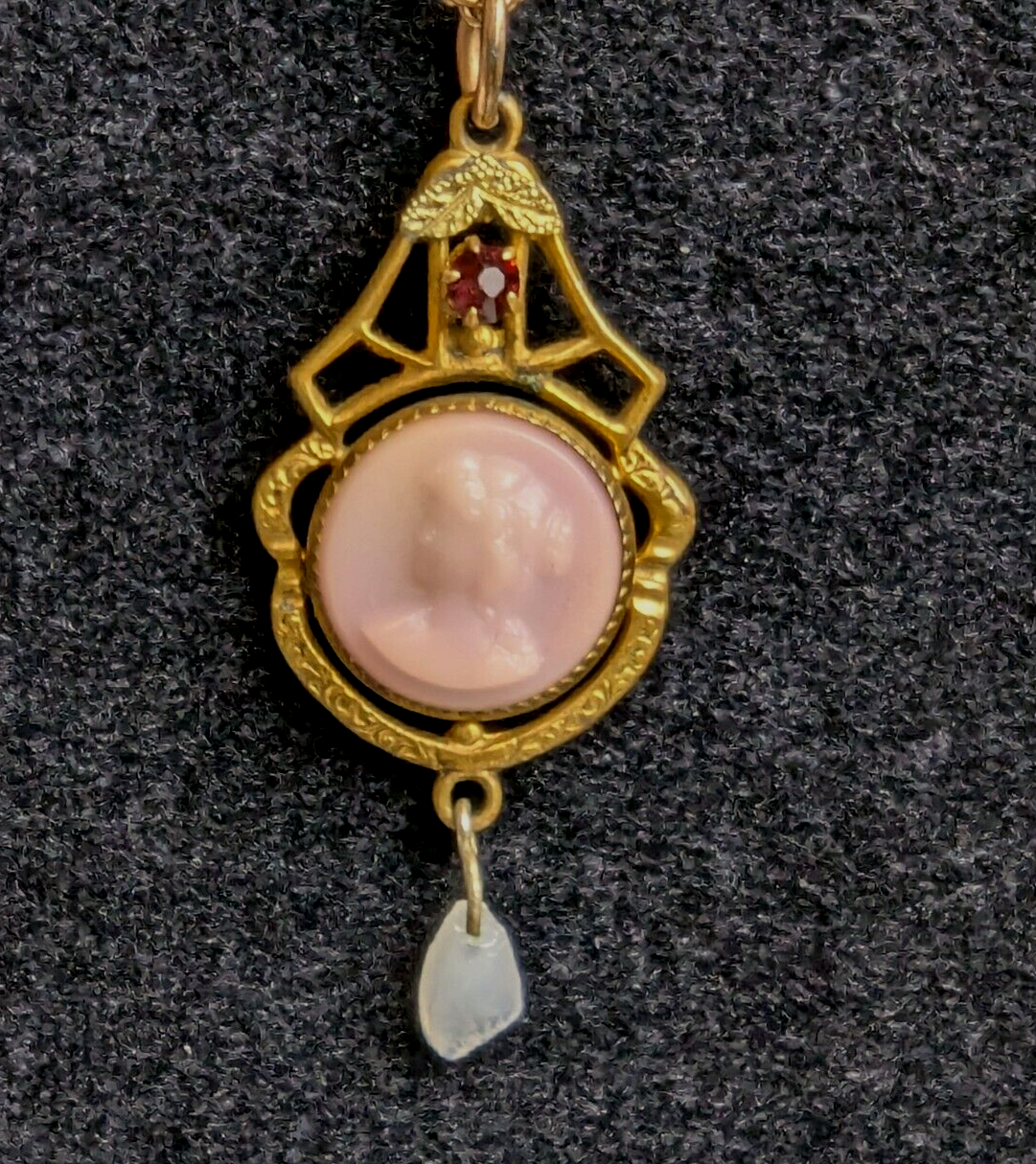 Sweet Antique/Vintage Yellow Gold Filled Pink Molded Glass Cameo Lavalier Necklace. Lavalier measures 1.5" in total length. Cameo pendant is prong set with a red jewel at the top and has a pearl chip dangle. Hangs from a 16" gold tone chain that has a spring ring clasp. 5025