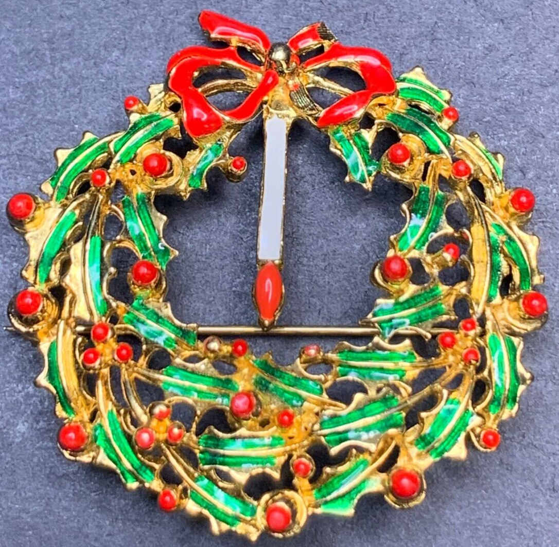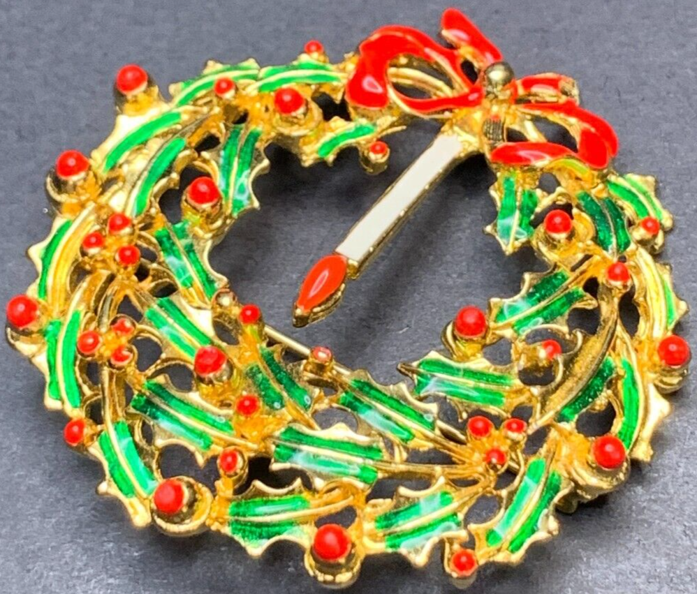 Vintage Gold Green Christmas Wreath Brooch Pin Decor