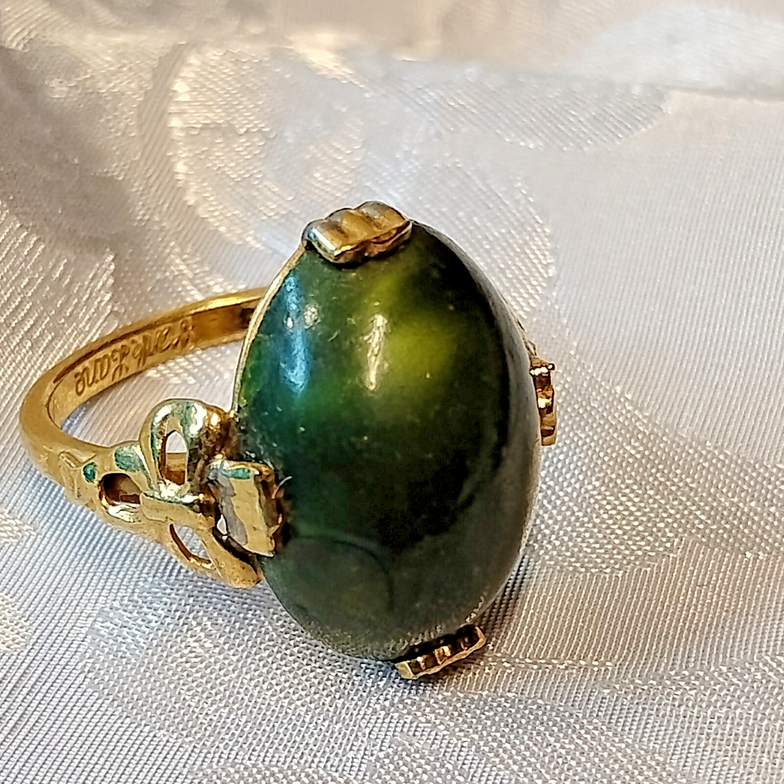 RING Signed on inner band - Park Lane. Size 6.5 Vintage Oval Shape Green Jelly Belly Style with Gold Color Metal. Exact materials unknown to me. A magnet does stick to the metal. Overall, in fair to good condition. Showing wear from time and use. Some of the gold color is worn. The oval green piece has either a hairline crack or it is part of the design. Please view all photos, thanks! Thanks for shopping by and please visit again soon for more jewelry and other goodies! Happy shopping! :) Cre8songs reference #187