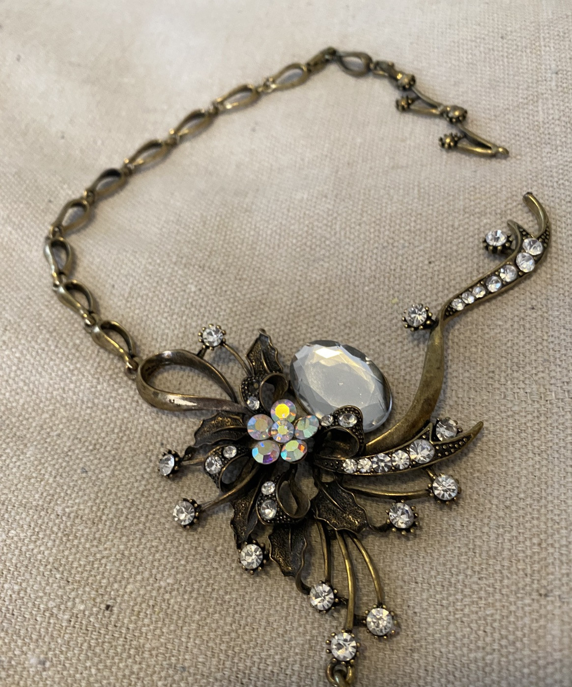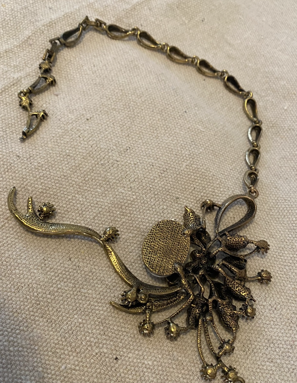 Vtg Flower Pendant Necklace Large Gold Tone Floral Costume Jewelry -Needs Repair Good pre-owned condition with flaw. Left side of necklace broke, needs to be repaired and joined back together. -Floral Pattern -Faux Jewels -Chained -SKU E25-029 -Measurements in Photos Questions? Please ask. Ships next business day. Offers welcome.