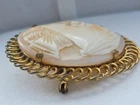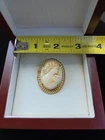 This elegant vintage cameo brooch features a finely carved shell portrait of a lady in profile, framed in a detailed gold tone filigree setting. The brooch measures approximately 1.75 inches tall by 1.25 inches wide and has a secure rollover clasp. Classic and timeless, this piece is perfect for collectors or as a romantic accent to any outfit. Material: Carved shell and gold tone metal Size: Approx. 1.75" x 1.25" Closure: Rollover clasp Condition: Good vintage condition with minor surface wear consistent with age A beautiful addition to any vintage jewelry collection! Box seen in photo is not included.