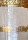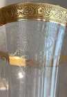 Exquisite 8.75" tall water goblet/wine glass, features a stunning gold-encrusted rim, gold trim on base, and an intricate etched basket design. Carefully designed to be a standout piece, it requires hand washing to maintain its luster and fine details.
