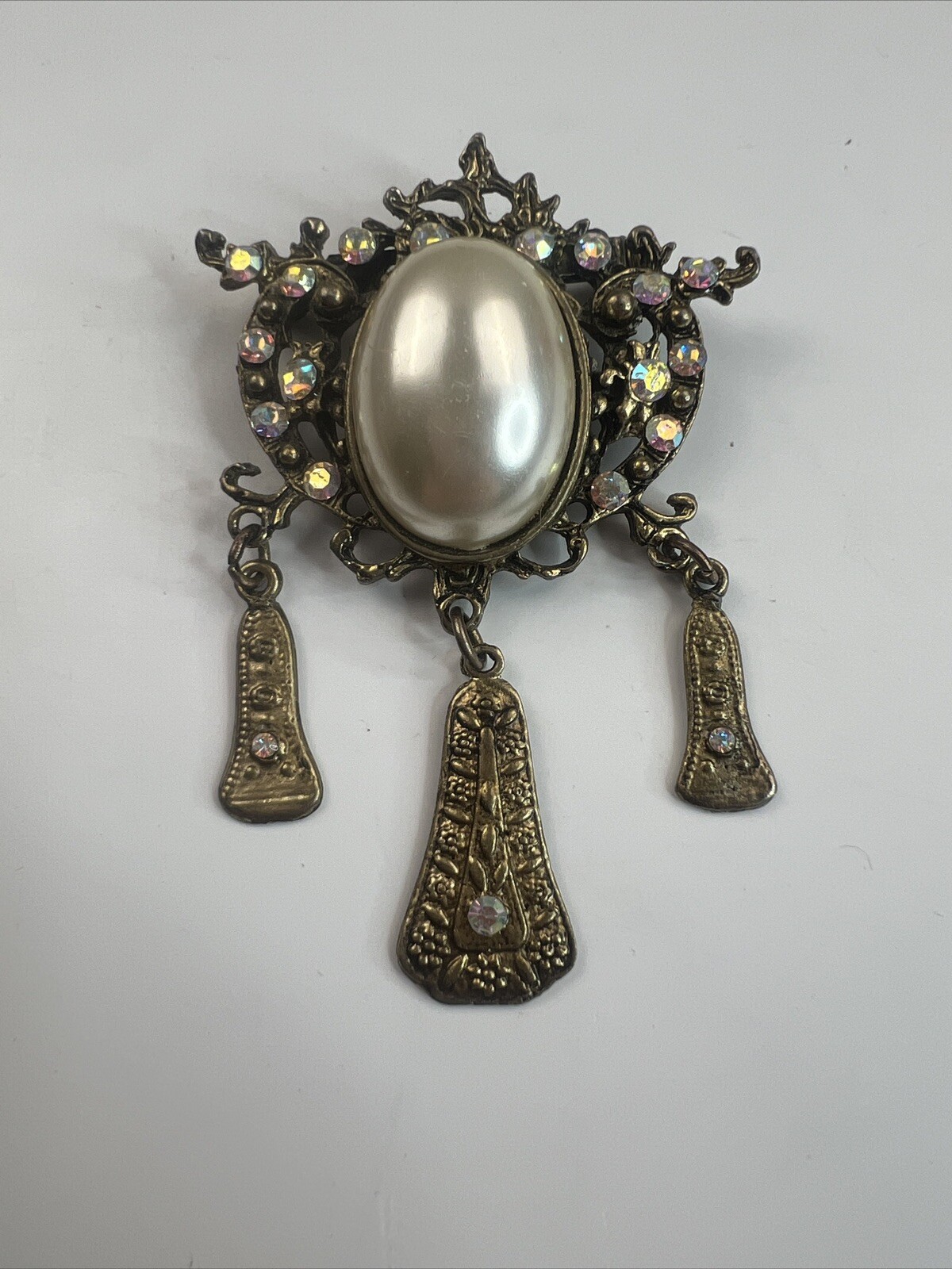 This vintage brooch pin is a stunning piece of goldtone Victorian romance jewelry. The faux pearls are delicate and creamy, complemented by the intricate design of the brooch. Perfect for adding a touch of elegance to any outfit, this brooch is a true statement piece. Its vintage status adds to its charm and makes it a unique addition to any jewelry collection. Ideal for those who appreciate the beauty of vintage jewelry, this brooch is a must-have for any fashion enthusiast.