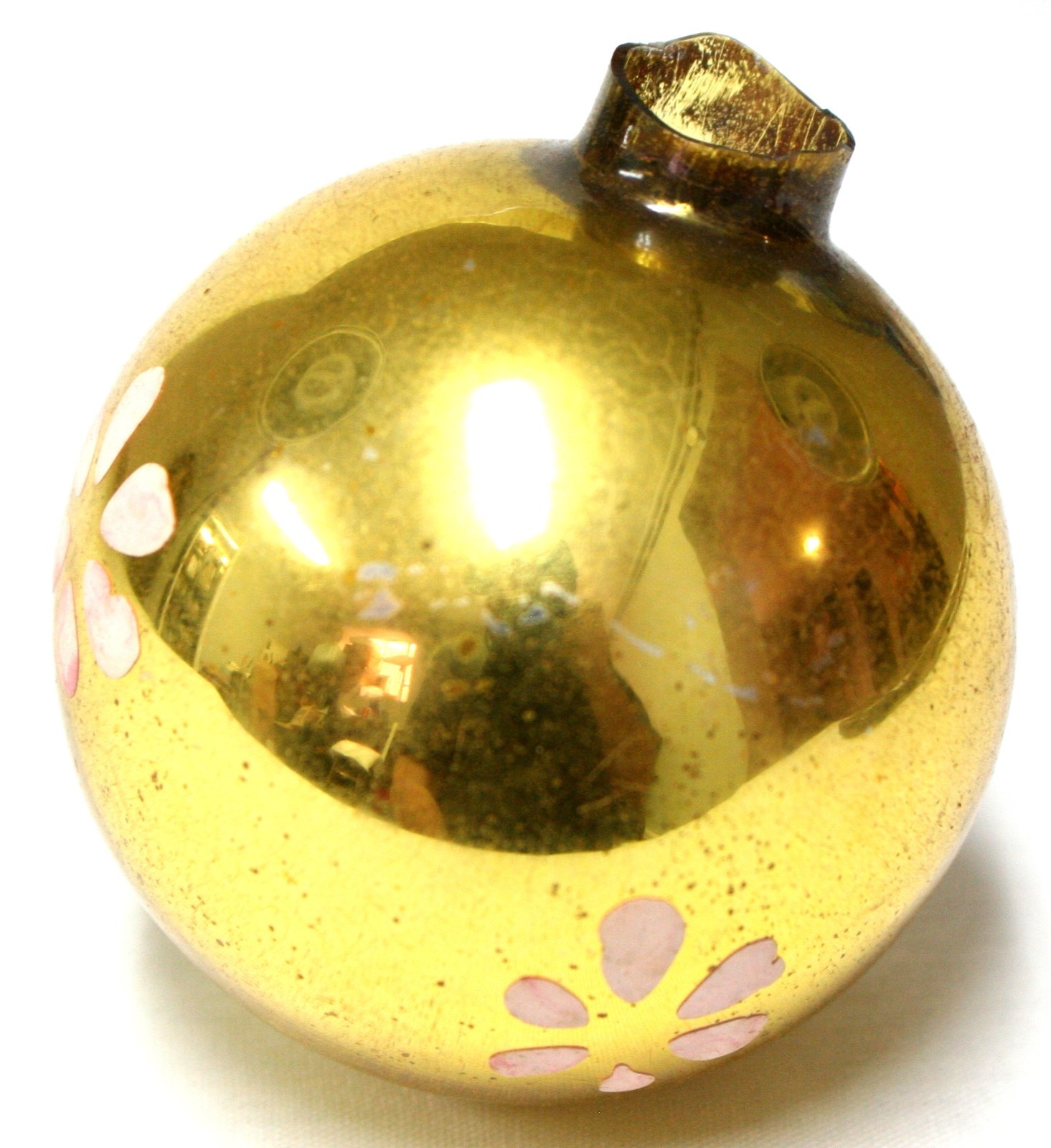 Christmas Ornament Golden Glass Ball With Pink Flowers Measures approximately 3" x 3" Please see pictures for details and condition. Condition is subjective and items are sold as is but I would be happy to answer questions or provide more pictures if needed. Also please let me know if you are not satisfied with your purchase for any reason before opening a case. I will work hard to make sure you are satisfied and you can always start a case if you are not happy with my response. I have a pretty relaxed return policy so if you don't like something I am happy to take it back. As always, if you have information that could help me improve my listing please share the knowledge and let me know. Thank you Check out my other items !