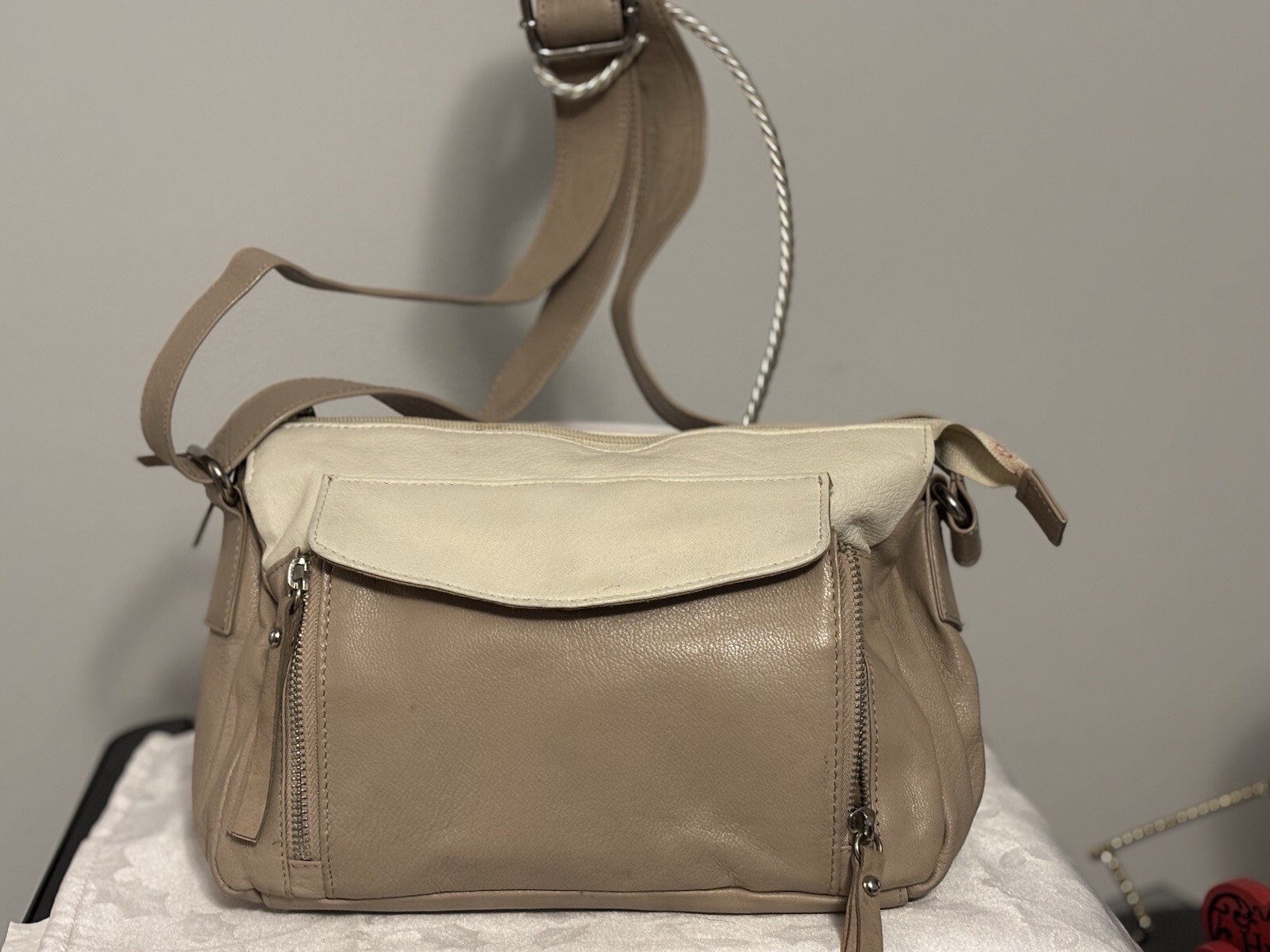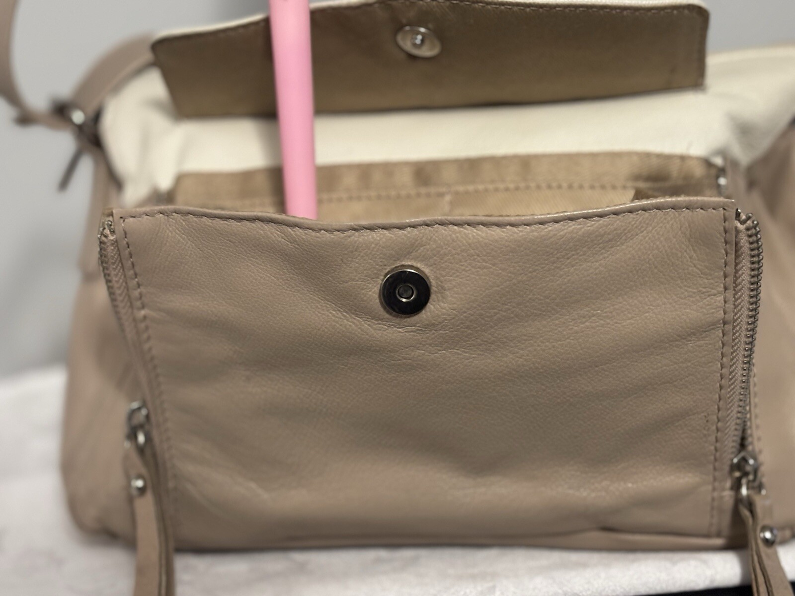 This Great American Leather Works handbag is a stylish and versatile accessory for travel, casual outings, or workwear. Made of taupe leather with cream accents, the rectangular bag features pleated details, tassel accents, and a zip closure. It has a medium size with a 14" shoulder strap drop, making it easy to carry. The bag is lined with fabric and includes credit card slots, outer pockets, and an adjustable strap for convenience. Perfect for those who appreciate American-made quality and a classic top handle bag style. Returns accepted within 30 days; buyer pays return shipping