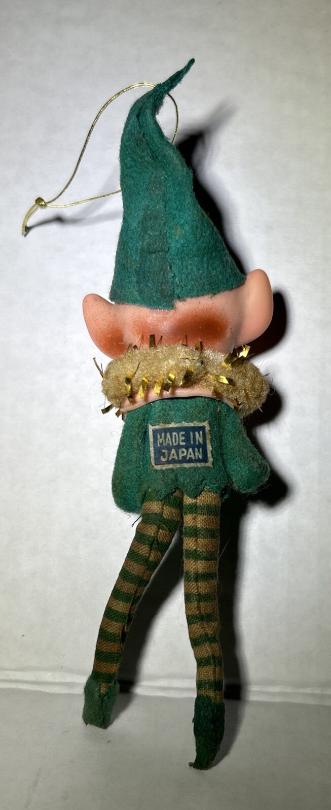 Absolutely adorable vintage pixie elf with so much character! The green rubber face is full of nostalgic charm, and despite the repaired boot (which gives it unique character), it’s in great condition. Perfect for adding a quirky, festive touch to any Christmas collection—love that it’s posable too! A fun little find.
