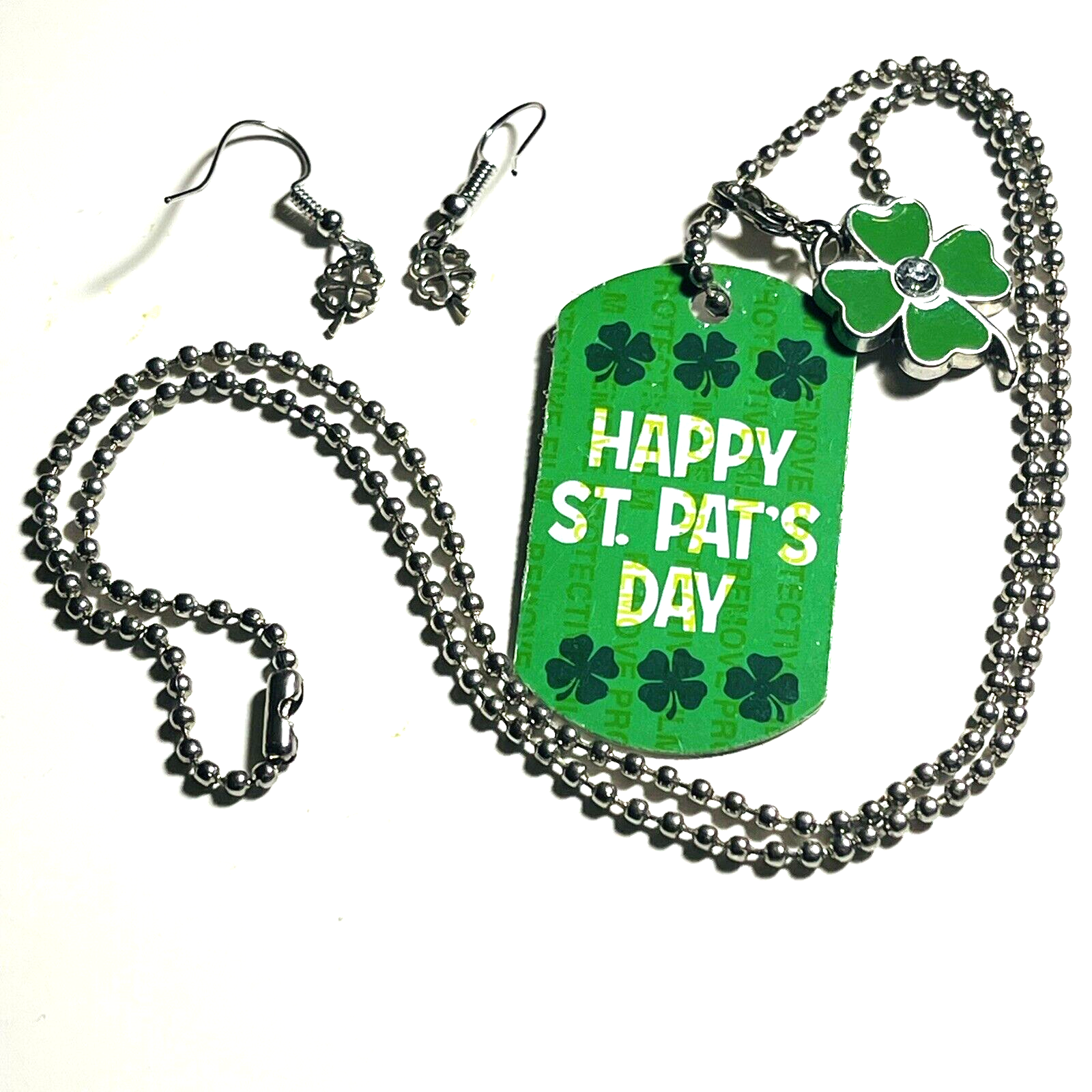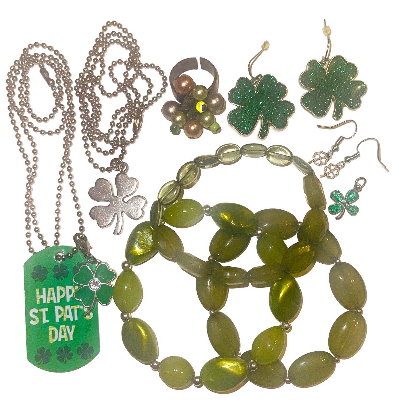 Fun lucky charms or St. Patrick's Day themed mix with necklaces, bead bracelets, earrings, pendant, charms and a ring. Pieces are wearable but would also be great for bead and charm harvest to use in your own jewelry designs and other craft projects. Collection features the color green of course and lucky four leaf clovers. 10 piece lot includes 2 ball chain necklaces with pendants and 1 four leaf clover clip charm, 3 bracelets, 2 pairs of dangle earrings, 1 adjustable ring and 1 small four leaf clover pendant. The length of the ball chains is 22 & 24 Inches. See photos taken with ruler for more description on size of jewelry. See photos. Zoom for more detail and assessment of condition. Feel free to contact me with questions. I will create custom bundles & give discounts for purchases of more than one item/listing + combine shipping for extra savings. Quotes provided on request. All sales are final. Returns are not accepted; however your satisfaction is important to me. Please reach out if there is a problem with your purchase. Thanks! PassionatelyCollected I passionately collect things.....